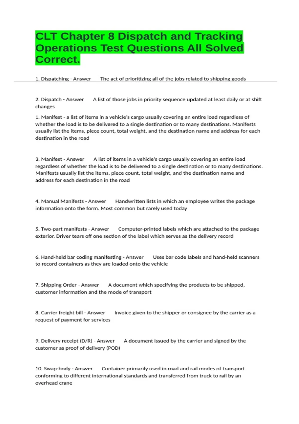 1. Dispatching - Answer The act of prioritizing all of the jobs related to shipping goods