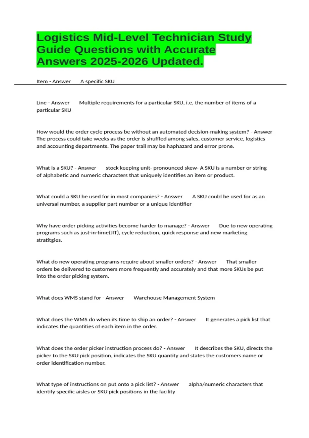 Logistics Mid-Level Technician Study Guide Questions with Accurate Answers Updated.