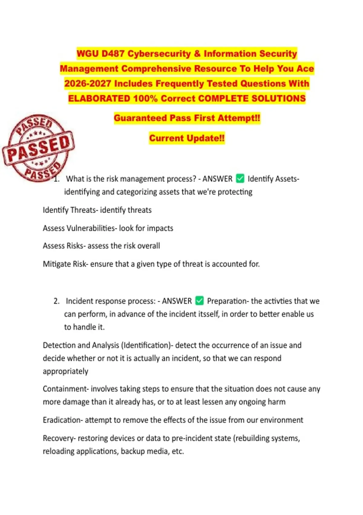 WGU D487 Cybersecurity & Information Security Management Comprehensive Resource To Help You Ace Includes Frequently Tested Questions With ELABORATED 100% Correct COMPLETE SOLUTIONS Guaranteed Pass First Attempt!! Current Update!! 1. What is the risk management process? - ANSWER - Identify Assets - identifying and categorizing assets that we're protecting - Identify Threats- identify threats - Assess Vulnerabilities- look for impacts - Assess Risks- assess the risk overall - Mitigate Risk- ensure that a given type of threat is accounted for. 2. Incident response process: - ANSWER Preparation- the activties that we can perform, in advance of the incident itsself, in order to better enable us to handle it. - Detection and Analysis (Identification)- detect the occurrence of an issue and decide whether or not it is actually an incident, so that we can respond appropriately . - Containment- involves taking steps to ensure that the situation does not cause any more damage than it already has, or to at least lessen any ongoing harm. - Eradication- attempt to remove the effects of the issue from our environment. - Recovery- restoring devices or data to pre-incident state (rebuilding systems, reloading applications, backup media, etc. - Post-incident activity- determine specifically what happened, why it happened and what we can to keep it from happening again. 3. Authorization - ANSWER what the user can assess, modify, delete 4. Least privilege - ANSWER giving the bare minimum level of access it needs to perform its job/functionality 5. What makes Access Control - ANSWER Allowing- lets us give a particular party access to a given source. - Denying- opposite of gaining access . - Limiting- allowing some access to our resource, only up to a certain point - Revoking- takes access away from former user - Access Control List- info about what kind of access certain parties are allowed to have to a given system. - Network ACL- filter access rules for incoming and outgoing network transactions, such as Internet Protocol (IP) Addresses, Media Access Control (MAC) addresses, and ports. 6. Discretionary (DAC) *Access Control Models - ANSWER owner of resources determines who gets access and what level of 7. Mandatory (MAC) *Access Control Models - ANSWER separate group or individual (from owner) has the authority to set access to recourses 8. Rule-based *Access Control Models - ANSWER allows access according to a set of rules defined by the system administrator 9. Role-based (RBAC) *Access Control Models - ANSWER functions access controls set by an authority responsible for doing so, rather than by the owner of the resource 10. Attribute-based (ABAC) *Access Control Models - ANSWER based on attributes, such as of a person, resource, or an environment 11. Accountability *Access Control Models - ANSWER refers to making sure that a person is responsible for their actions. It provides us with the means to trace activities in our environment back to their source. 12. Nonrepudiation *Access Control Models - ANSWER a situation in which sufficient evidence exists as to prevent an individual from successfully denying that he or she has made a statement or taken an action 13. Intrusion detection (IDSes) *Access Control Models - ANSWER monitors and reports malicious events 14. Intrusion prevention (IPSes) *Access Control Models - ANSWER takes actions when malicious events occur 15. Auditing *Access Control Models - ANSWER the examination and review of an organizations records to ensure accountability through technical means