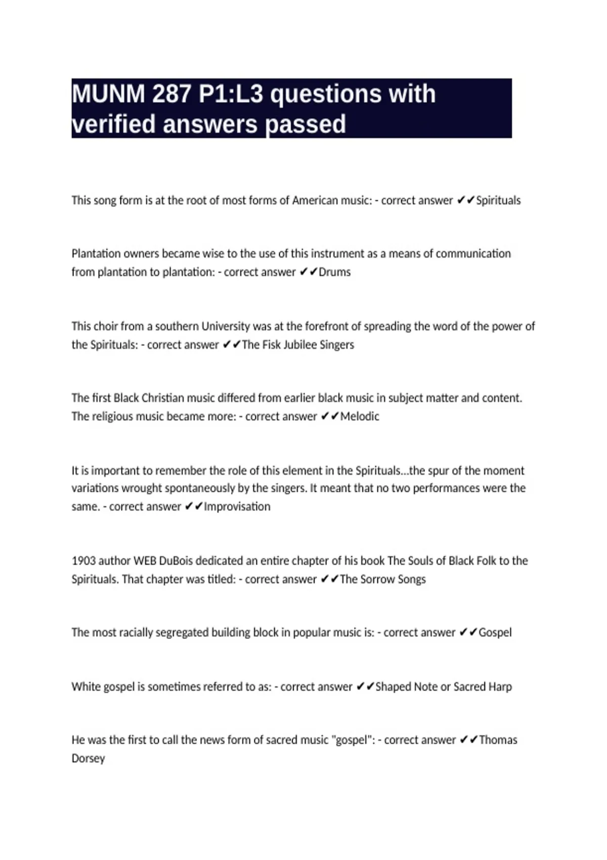 This song form is at the root of most forms of American music: - correct answer ✔✔Spirituals