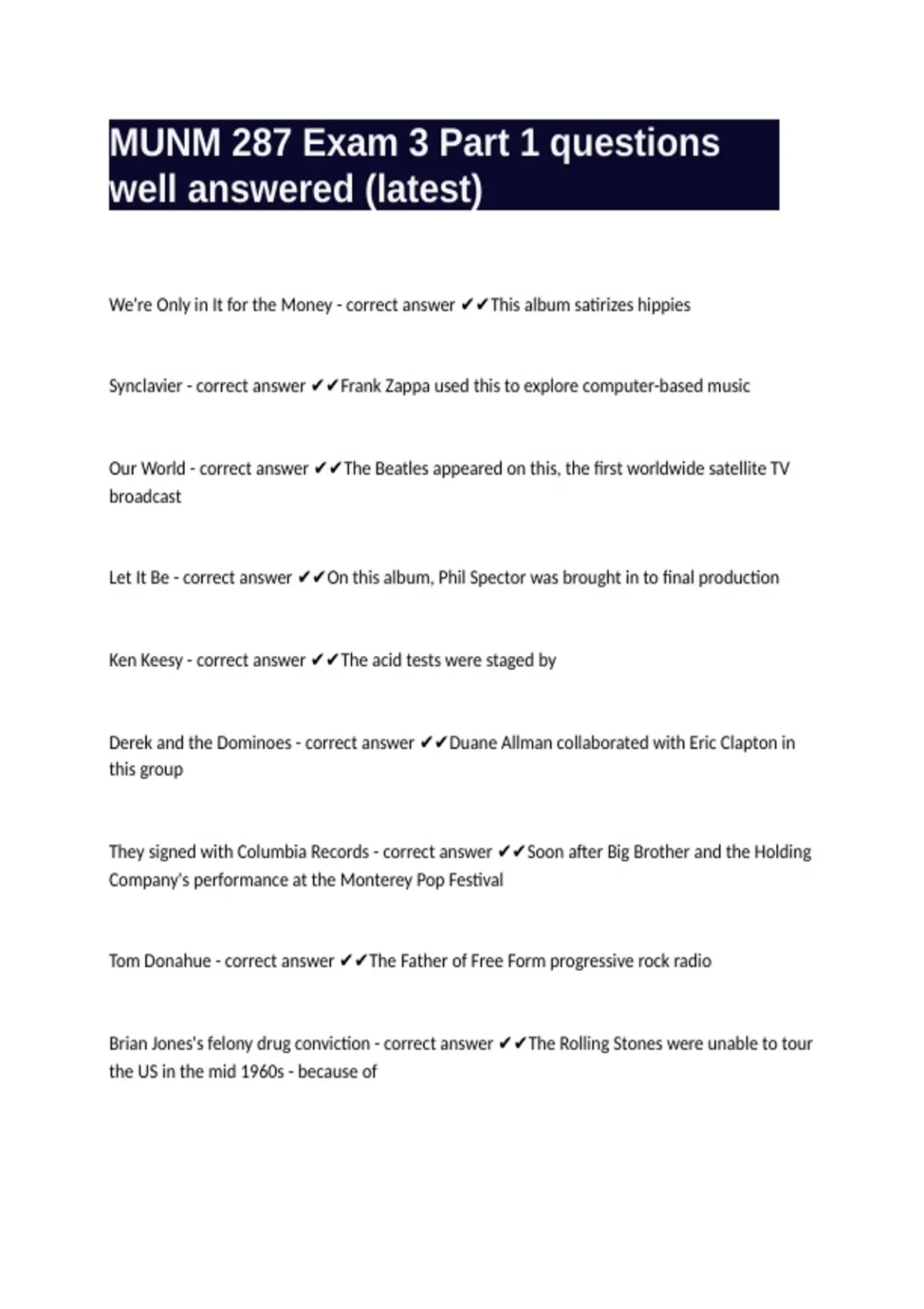 Brian Jones's felony drug conviction - correct answer ✔✔The Rolling Stones were unable to tour