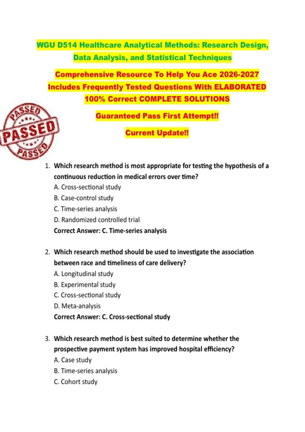 WGU D514 Healthcare Analytical Methods: Research Design, Data Analysis, and Statistical Techniques Comprehensive Resource To Help You Ace Includes Frequently Tested Questions With ELABORATED 100% Correct COMPLETE SOLUTIONS Guaranteed Pass First Attempt!! Current Update!! 1. Which research method is most appropriate for testing the hypothesis of a continuous reduction in medical errors over time? A. Cross-sectional study B. Case-control study C. Time-series analysis D. Randomized controlled trial Correct Answer: C. Time-series analysis 2. Which research method should be used to investigate the association between race and timeliness of care delivery? A. Longitudinal study B. Experimental study C. Cross-sectional study D. Meta-analysis Correct Answer: C. Cross-sectional study 3. Which research method is best suited to determine whether the prospective payment system has improved hospital efficiency? A. Case study B. Time-series analysis C. Cohort study D. Focus group Correct Answer: B. Time-series analysis 4. Which type of data analysis is commonly used in quantitative research? A. Narrative interpretation B. Reporting distributions of results or outcomes C. Open-ended interviews D. Focus group analysis Correct Answer: B. Reporting distributions of results or outcomes 5. Which characteristic is associated with qualitative research methods? A. Numerical measurement B. Statistical inference C. Introduces subjectivity to data collection D. Random sampling Correct Answer: C. Introduces subjectivity to data collection 6. Which research method was used to evaluate blood glucose levels for patients participating in virtual visits? A. Longitudinal study B. Experimental design C. Cross-sectional study D. Case-control study Correct Answer: C. Cross-sectional study 7. Which research method is used when reviewing published studies to assess clinical effectiveness? A. Literature review B. Meta-analysis C. Cohort study D. Pretest-posttest study Correct Answer: B. Meta-analysis 8. Which research method is most appropriate for studying the effectiveness of an initiative coordinating immunizations for children in foster care? A. Cross-sectional study B. Case study C. Pretest-posttest study D. Time-series analysis Correct Answer: C. Pretest-posttest study