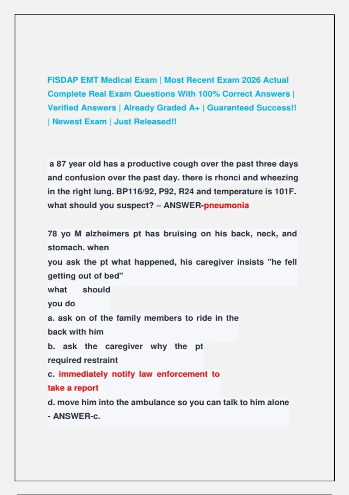FISDAP EMT Medical Exam | Most Recent Exam 2026 Actual Complete Real Exam Questions With 100% Correct Answers | Verified Answers | Already Graded A+ | Guaranteed Success!! | Newest Exam | Just Released!! FISDAP EMT Medical Exam | Most Recent Exam 2026 Actual Complete Real Exam Questions With 100% Correct Answers | Verified Answers | Already Graded A+ | Guaranteed Success!! | Newest Exam | Just Released!! FISDAP EMT Medical Exam | Most Recent Exam 2026 Actual Complete Real Exam Questions With 100% Correct Answers | Verified Answers | Already Graded A+ | Guaranteed Success!! | Newest Exam | Just Released!! FISDAP EMT Medical Exam | Most Recent Exam 2026 Actual Complete Real Exam Questions With 100% Correct Answers | Verified Answers | Already Graded A+ | Guaranteed Success!! | Newest Exam | Just Released!! FISDAP EMT Medical Exam | Most Recent Exam 2026 Actual Complete Real Exam Questions With 100% Correct Answers | Verified Answers | Already Graded A+ | Guaranteed Success!! | Newest Exam | Just Released!! FISDAP EMT Medical Exam | Most Recent Exam 2026 Actual Complete Real Exam Questions With 100% Correct Answers | Verified Answers | Already Graded A+ | Guaranteed Success!! | Newest Exam | Just Released!!