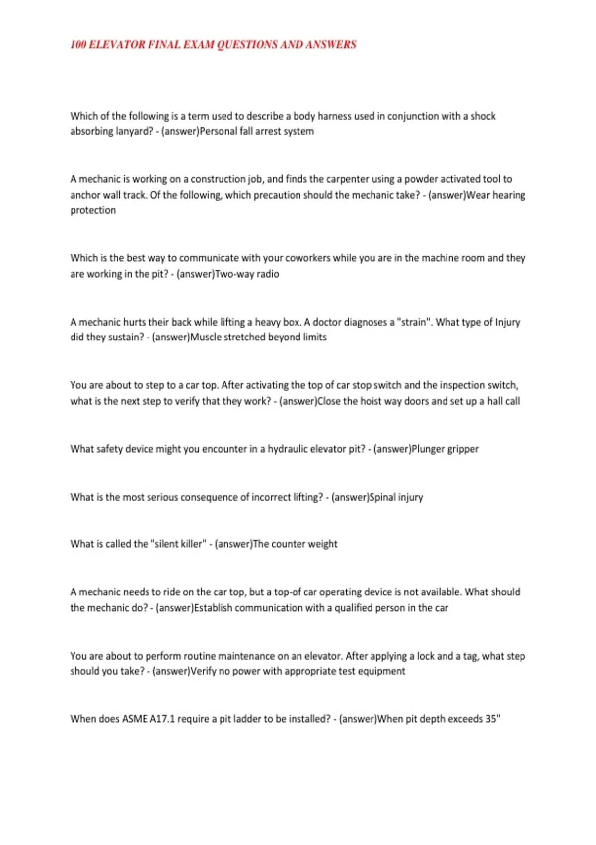100 ELEVATOR FINAL EXAM QUESTIONS AND ANSWERS