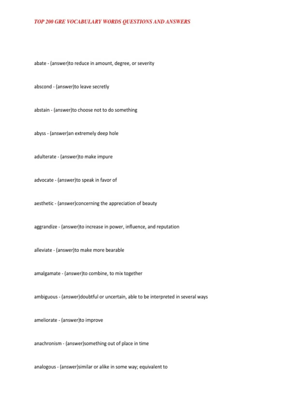 , TOP 200 GRE VOCABULARY WORDS QUESTIONS AND ANSWERS