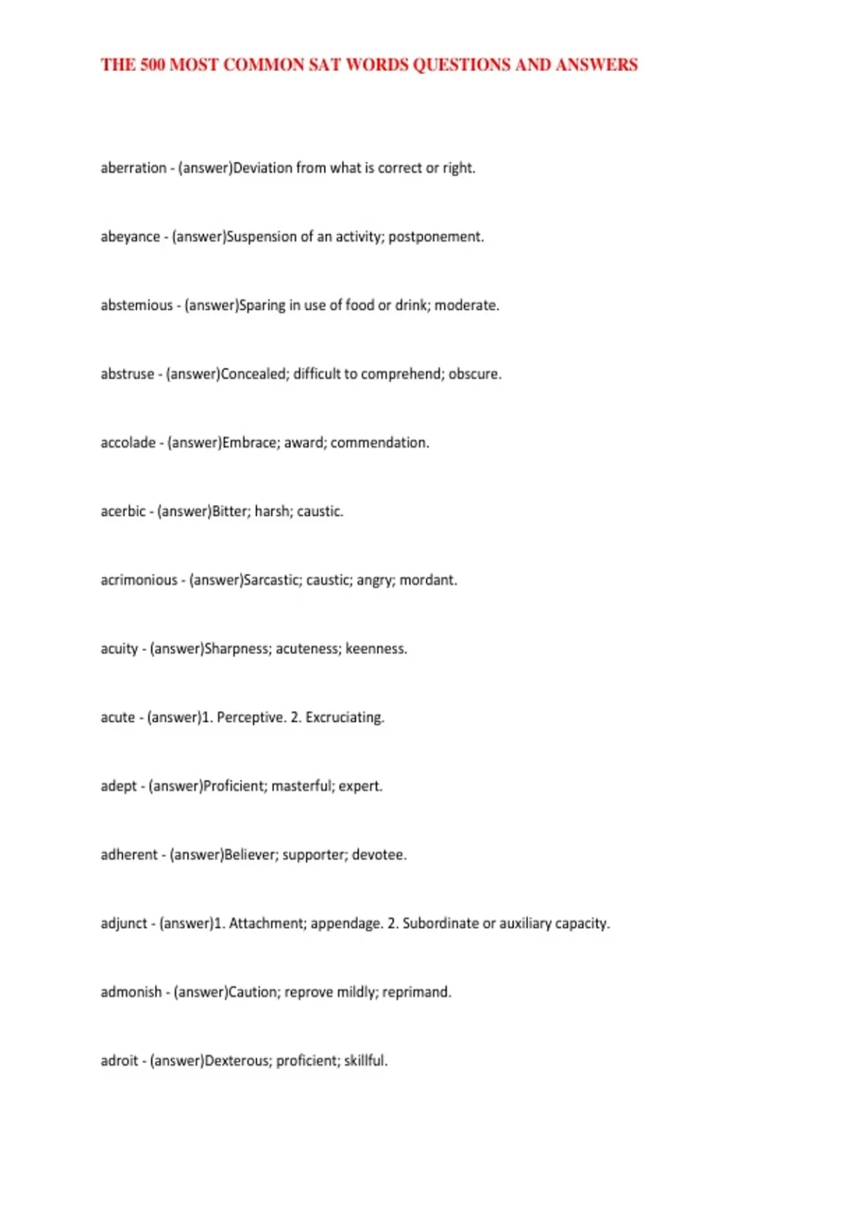 ,THE 500 MOST COMMON SAT WORDS QUESTIONS AND ANSWERS