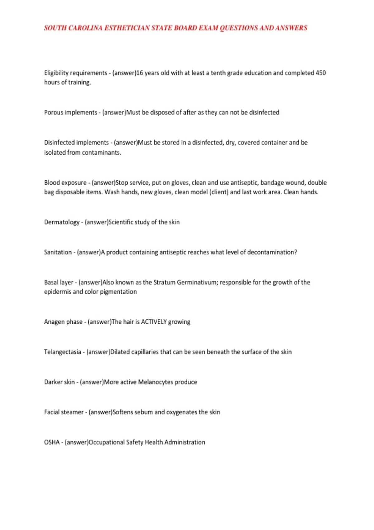 , SOUTH CAROLINA ESTHETICIAN STATE BOARD EXAM QUESTIONS AND ANSWERS