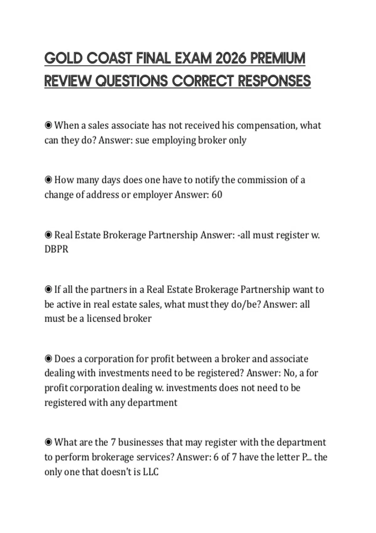 GOLD COAST FINAL EXAM 2026 PREMIUM REVIEW QUESTIONS CORRECT RESPONSES