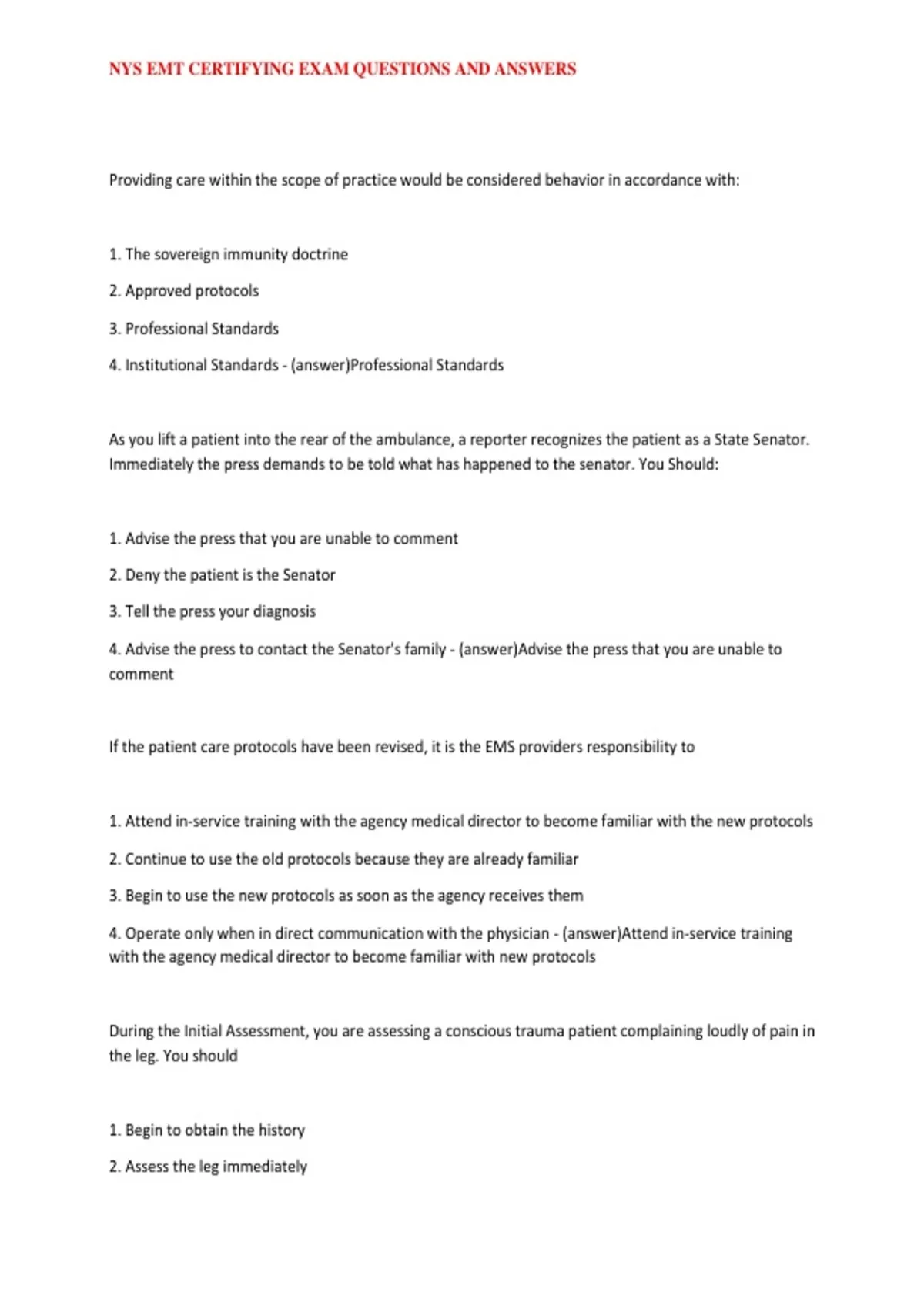 NYS EMT CERTIFYING EXAM QUESTIONS AND ANSWERS
