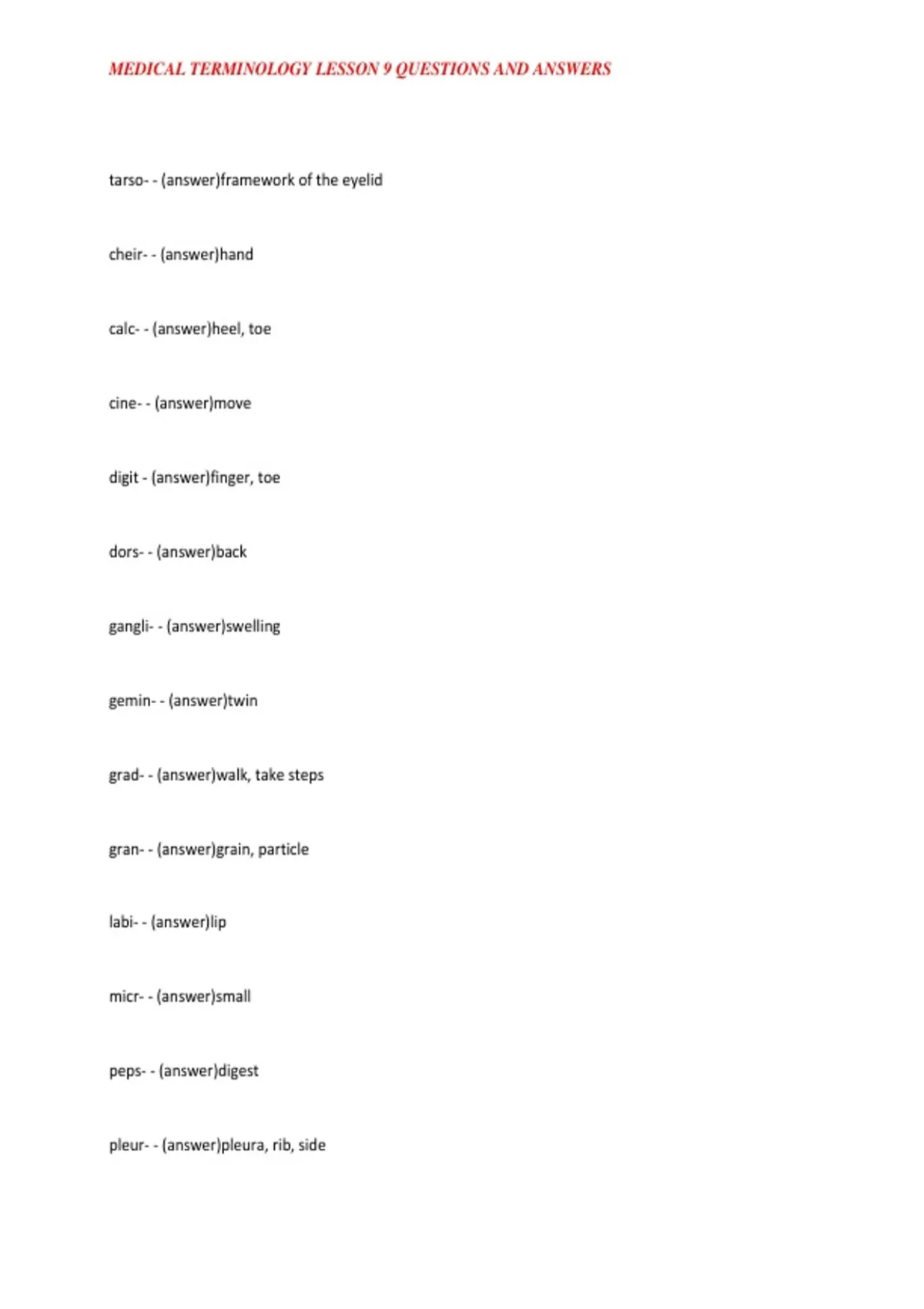 MEDICAL TERMINOLOGY LESSON 9 QUESTIONS AND ANSWERS