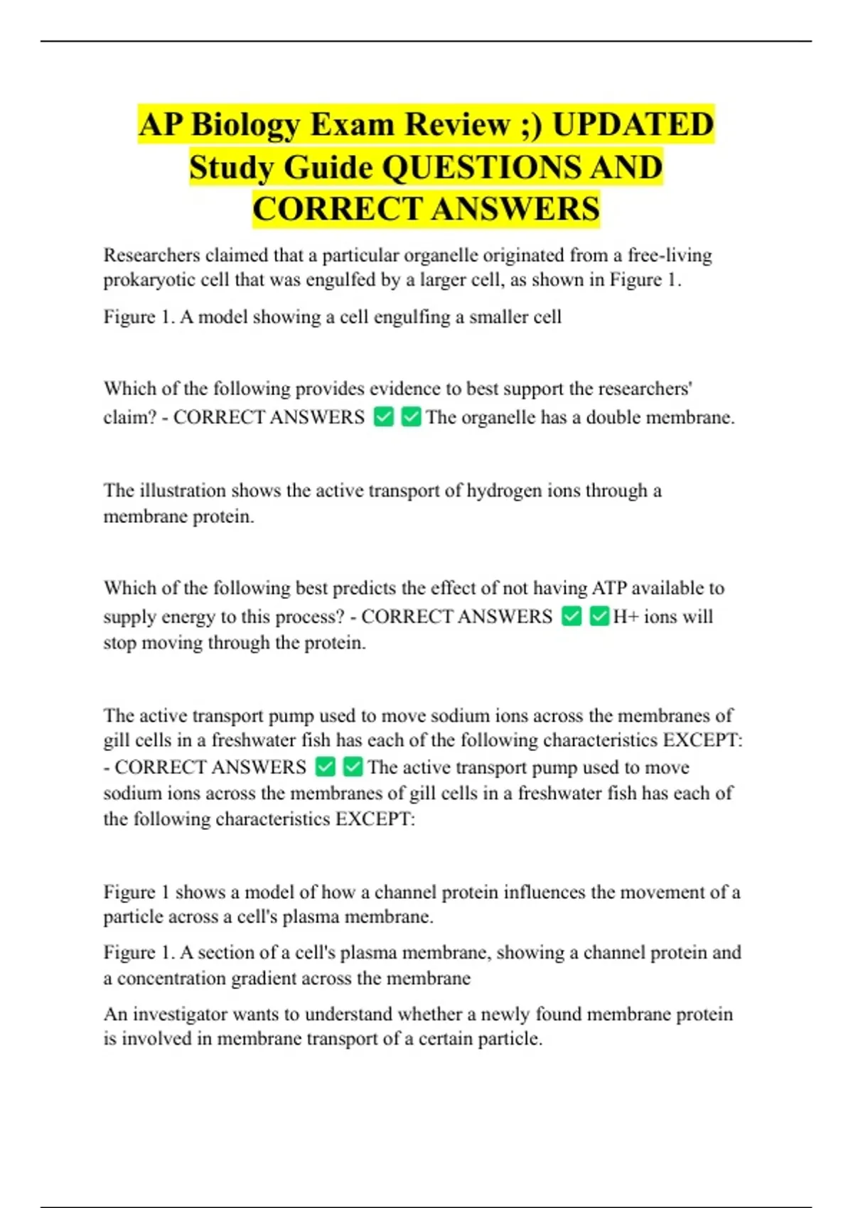 AP Biology Exam Review ;) UPDATED Study Guide QUESTIONS AND CORRECT ANSWERS Researchers claimed that a particular organelle originated from a free-living prokaryotic cell that was engulfed by a larger cell, as shown in Figure 1.