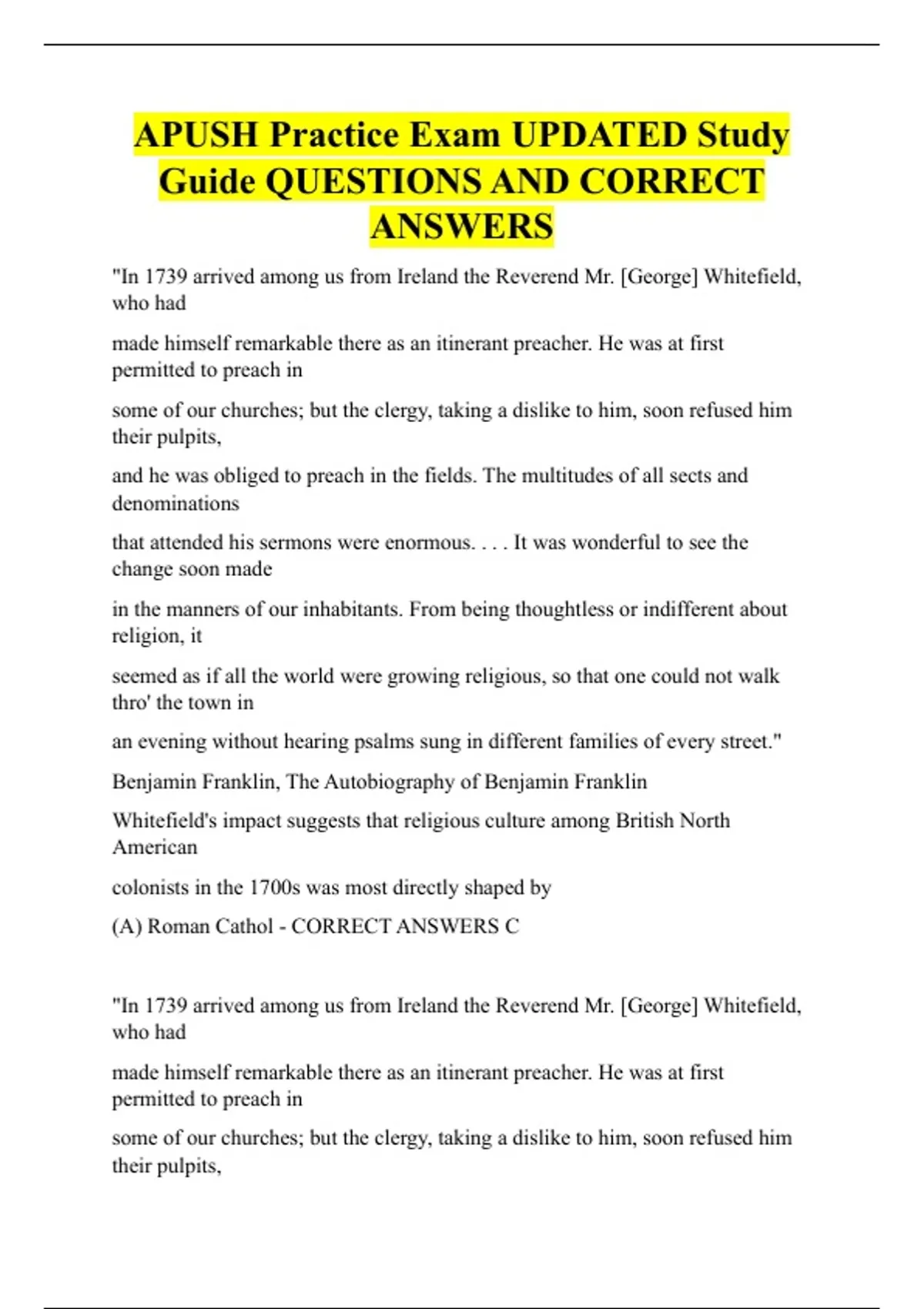 APUSH Practice Exam UPDATED Study Guide QUESTIONS AND CORRECT ANSWERS "In 1739 arrived among us from Ireland the Reverend Mr. [George] Whitefield, who had made himself remarkable there as an itinerant preacher. He was at first permitted to preach in some of our churches; but the clergy, taking a dislike to him, soon refused him