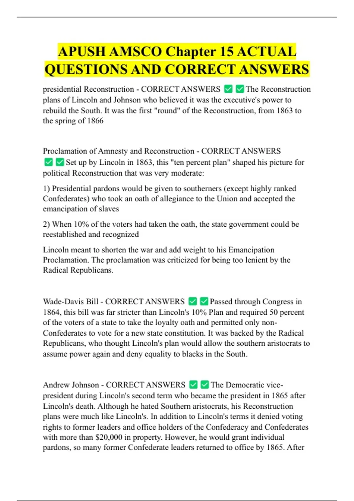 APUSH AMSCO Chapter 15 ACTUAL QUESTIONS AND CORRECT ANSWERS presidential Reconstruction - CORRECT ANSWERS The Reconstruction plans of Lincoln and Johnson who believed it was the executive's power to rebuild the South. It was the first "round" of the Reconstruction, from 1863 to