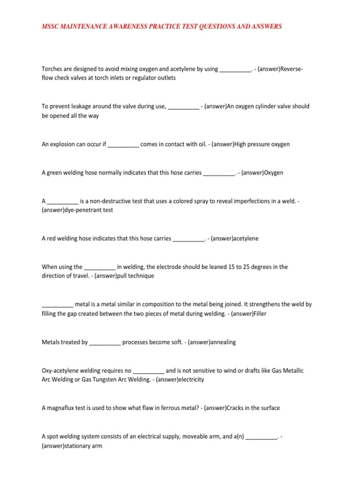 , MSSC MAINTENANCE AWARENESS PRACTICE TEST QUESTIONS AND ANSWERS