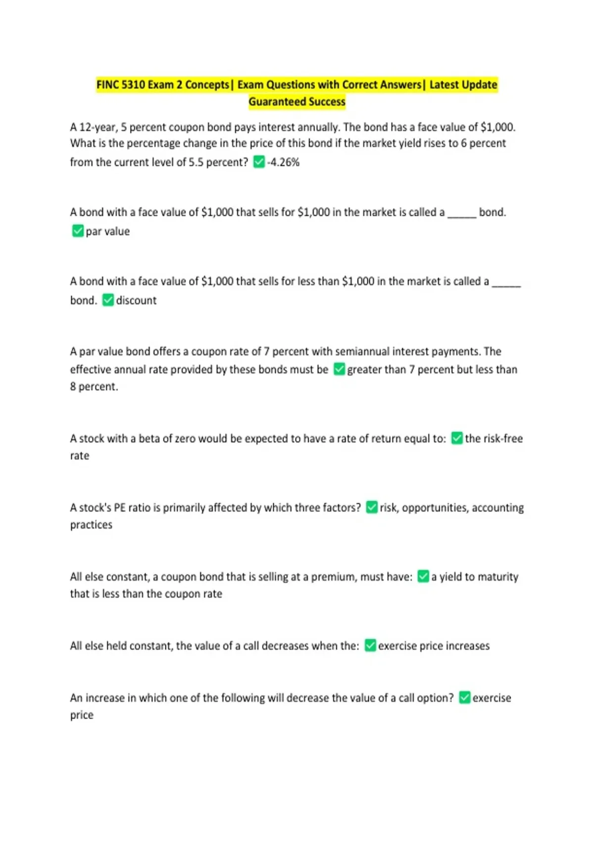 FINC 5310 Exam 2 Concepts| Exam Questions with Correct Answers| Latest Update