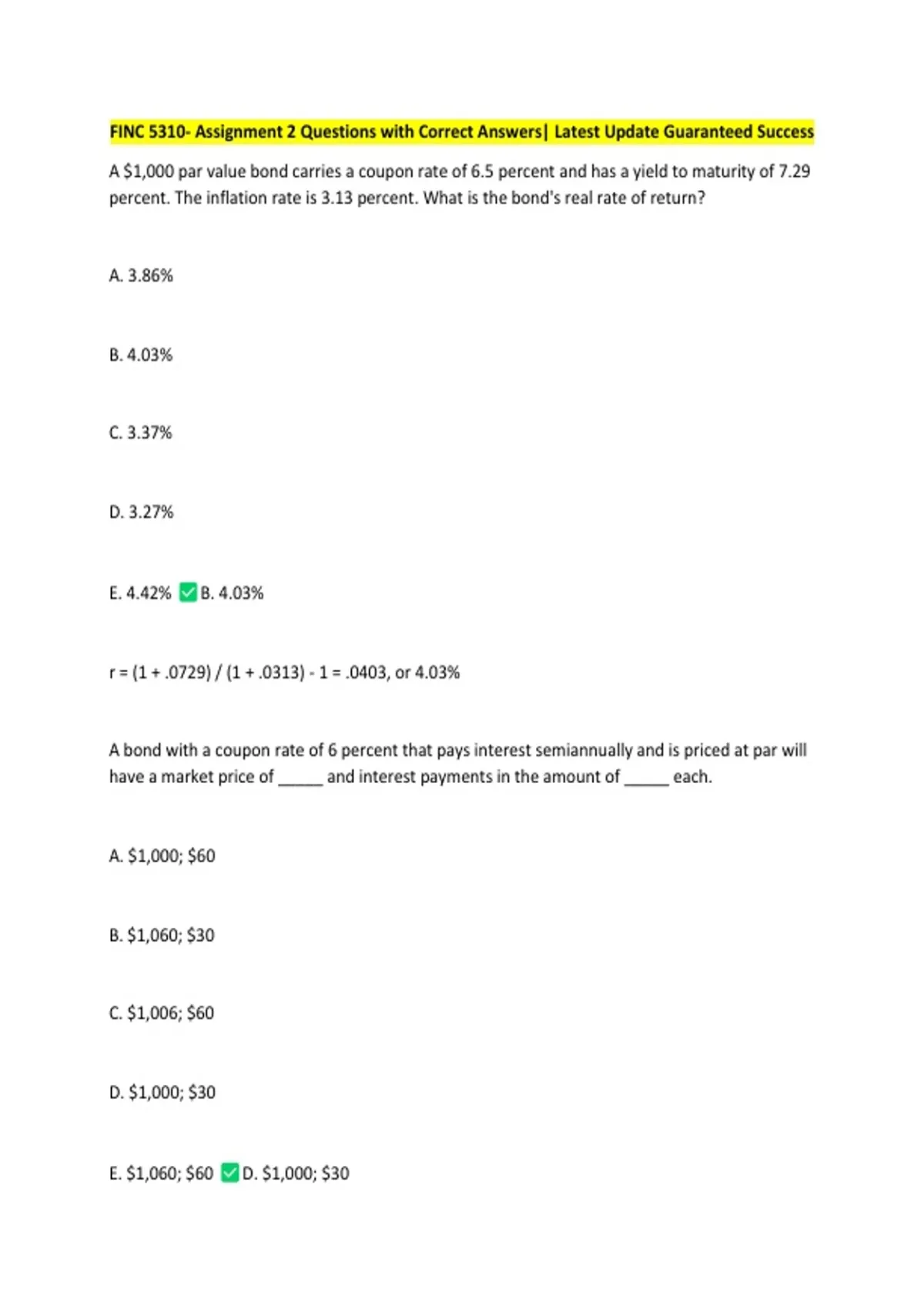 FINC 5310- Assignment 2 Questions with Correct Answers| Latest Update Guaranteed Success