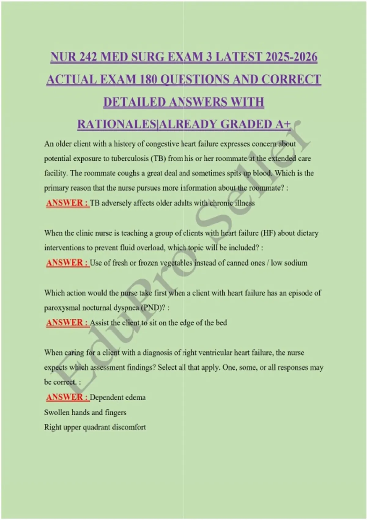 NUR 242 MED SURG EXAM 3 LATEST ACTUAL EXAM 180 QUESTIONS AND CORRECT DETAILED ANSWERS WITH RATIONALES|ALREADY GRADED A+
