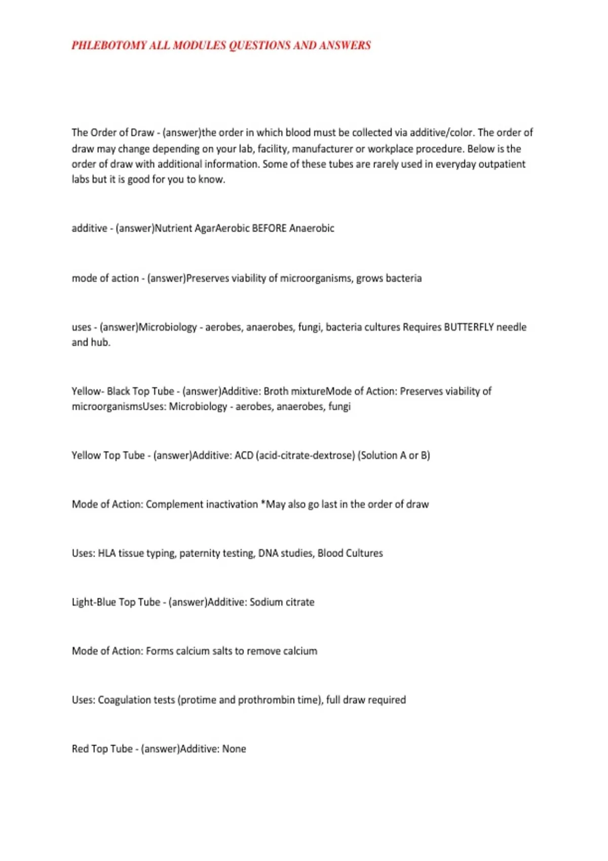 , PHLEBOTOMY ALL MODULES QUESTIONS AND ANSWERS
