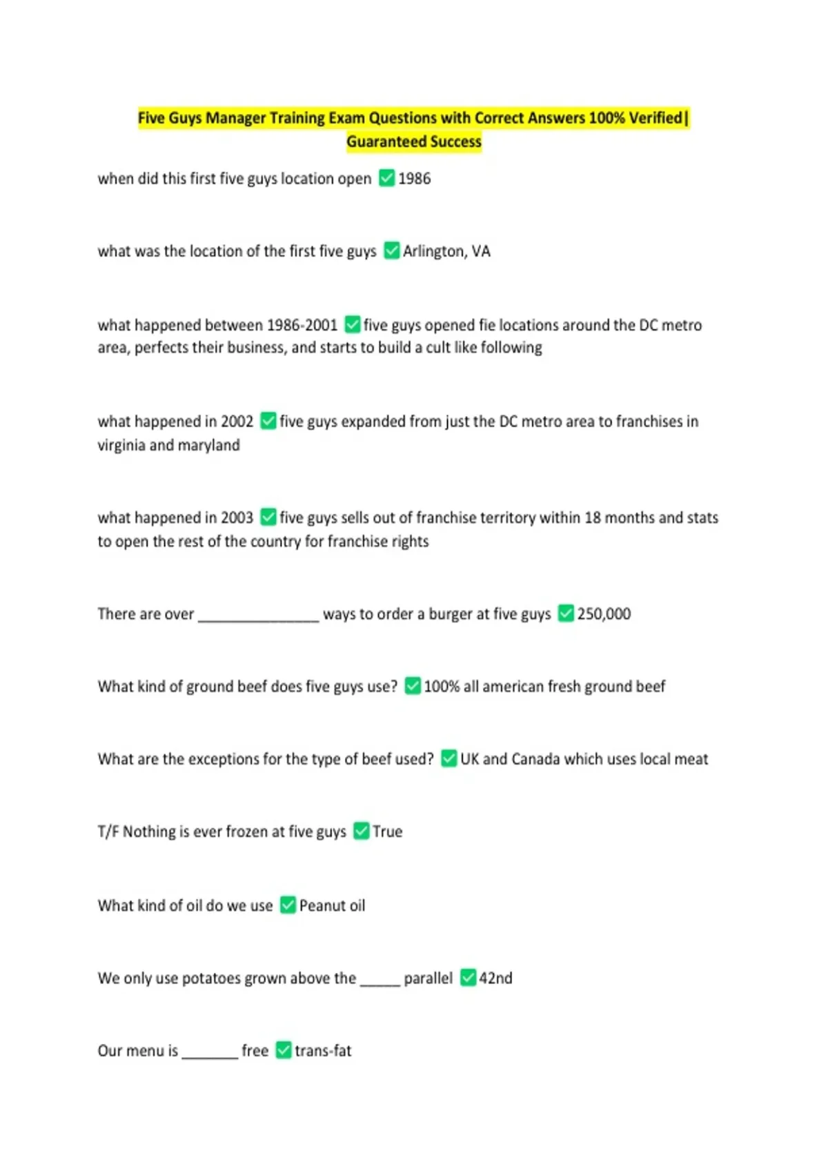 Five Guys Manager Training Exam Questions with Correct Answers 100% Verified|