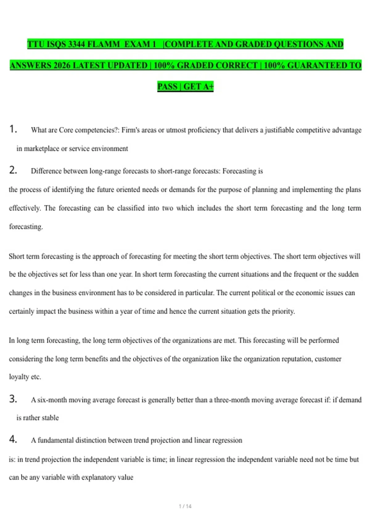 TTU ISQS 3344 FLAMM EXAM 1 |COMPLETE AND GRADED QUESTIONS AND ANSWERS 2026 LATEST UPDATED | 100% GRADED CORRECT | 100% GUARANTEED TO PASS | GET A+