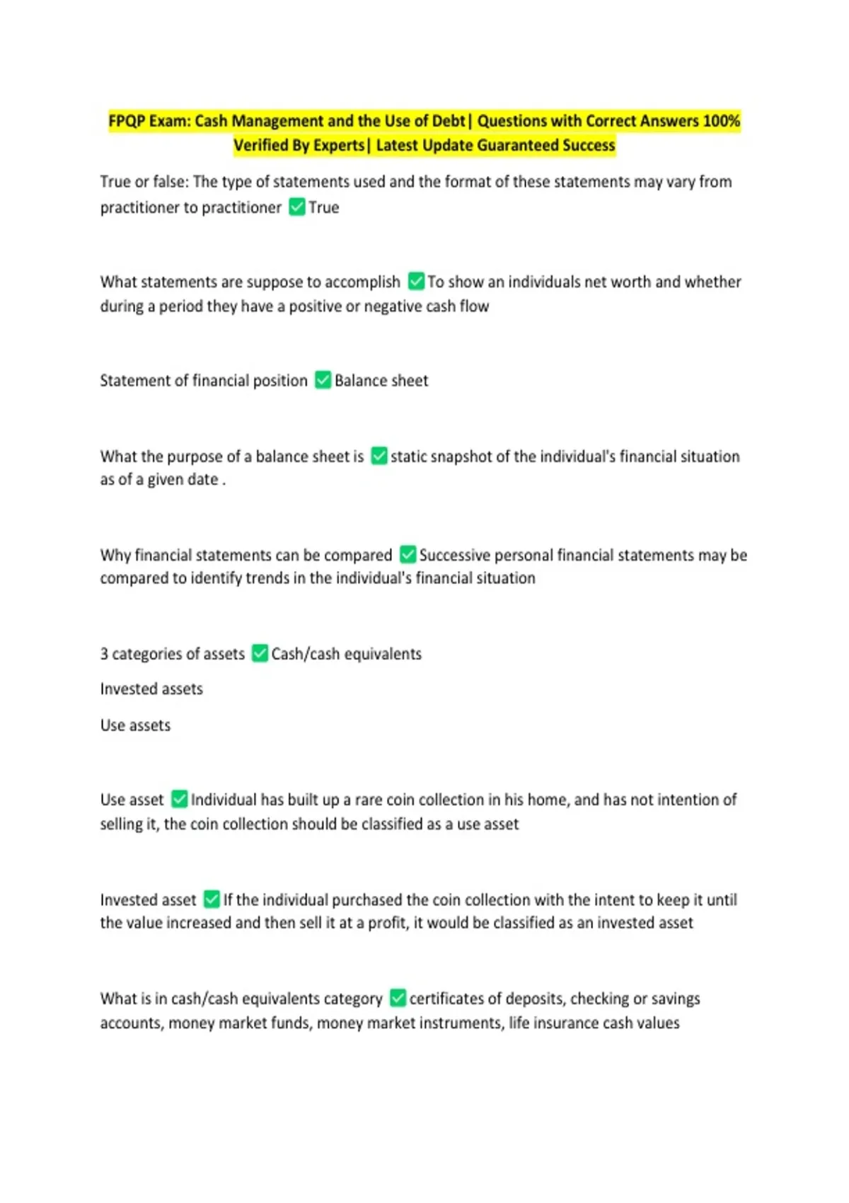 FPQP Exam: Cash Management and the Use of Debt| Questions with Correct Answers 100%