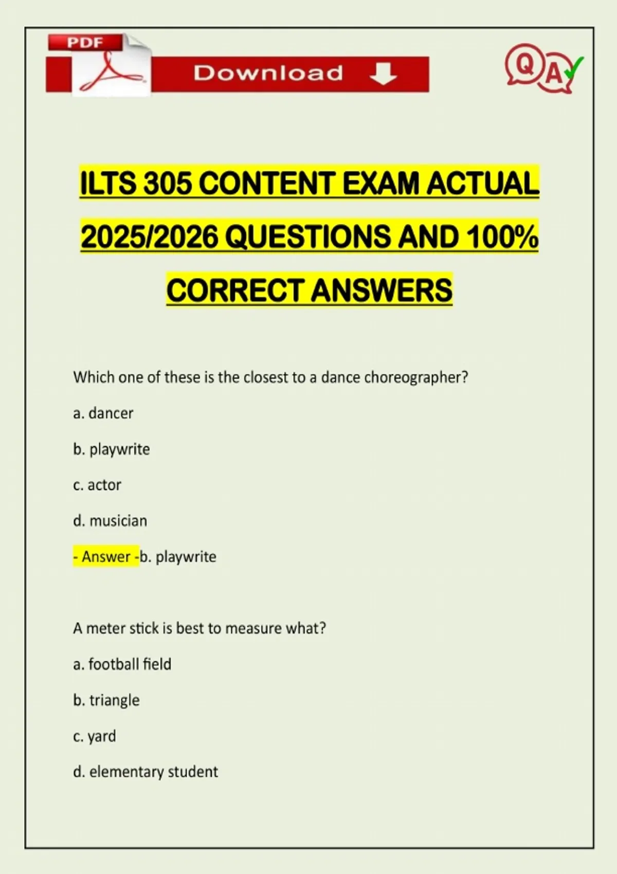 ILTS 305 CONTENT EXAM ACTUAL 2025/2026 QUESTIONS AND 100% CORRECT ANSWERS Which one of these is the closest to a dance choreographer? a. dancer b. playwrite c. actor d. musician - Answer -b. playwrite A meter stick is best to measure what? a. football field b. triangle c. yard d. elementary