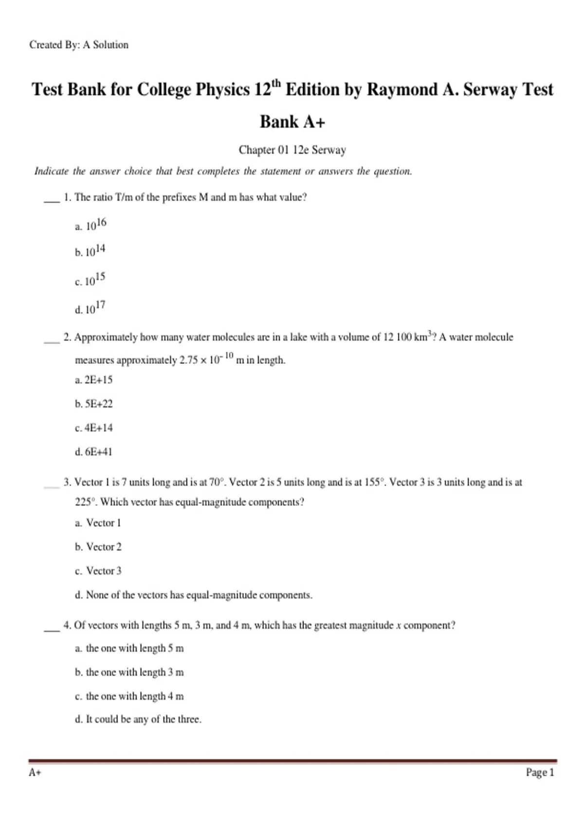 Test Bank for College Physics, 12th Edition by Raymond A. Serway: All Chapters, Verified