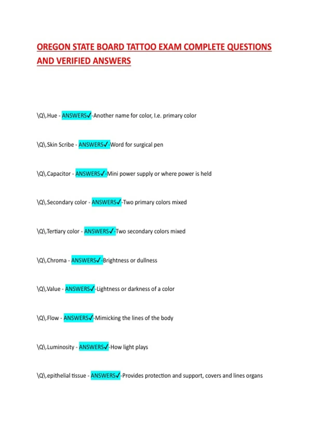 OREGON STATE BOARD TATTOO EXAM COMPLETE QUESTIONS AND VERIFIED ANSWERS Q.Hue - ANSWERS-Another name for color, I.e. primary color Q.Skin Scribe - ANSWERS-Word for surgical pen Q.Capacitor - ANSWERS-Mini power supply or where power is held Q.Secondary color - ANSWERS-Two primary colors mixed Q.Tertiary color - ANSWERS-Two secondary colors mixed Q.Chroma - ANSWERS-Brightness or dullness Q.Value - ANSWERS-Lightness or darkness of a color Q.Flow - ANSWERS-Mimicking the lines of the body Q.Luminosity - ANSWERS-How light plays Q.epithelial tissue - ANSWERS-Provides protection and support, covers and lines organs Q.Connective tissue - ANSWERS-Holds together specialized area of the human body Q.Muscle tissue - ANSWERS-Contracts to provide body movement or movement of things in or through the body Q.Nerve tissue - ANSWERS-Conducts electrical impulses between all parts of the body Q.Acute - ANSWERS-Something that is severe and short lived Q.Asepsis - ANSWERS-Freedom from disease causing agents or germs Q.Sterilize - ANSWERS-To render completely free of germs, a total kill of everything Q.EPA - ANSWERS-Environmental Protection Agency Q.FDA - ANSWERS-Food and Drug Administration Q.High level disinfectant - ANSWERS-A chemical agent registered with the EPA that has demonstrated tuberculocidal activity Q.Instruments - ANSWERS-Equipment used during tattoo services, included but not limited to needles and tubes Q.Office - ANSWERS-Refers to the Health Licensing Office Q.OFFICIAL TRANSCRIPT - ANSWERS-An original document authorized by the appropriate office in the Higher Education Coordinating Commission and certified by a career school Q.sharps container - ANSWERS-A puncture-resistant, leak proof container that can be closed for handling, transportation, storage and disposal. Must be labeled with a biohazard symbol Q.210 hours - ANSWERS-How many total hours of theory must be completed Q.30 days - ANSWERS-How long is a temporary tattoo license good for Q.2 times in a 12 month period - ANSWERS-How often can you renew a temporary tattoo license Q.20 days - ANSWERS-How long do you have to request a temporary tattoo license renewal before the services are provided Q.24 hours - ANSWERS-How long before do you need to notify the office of a change in work location for a temporary tattoo license Q.1 year - ANSWERS-How long is a tattoo license valid for Q.3 years - ANSWERS-How long can a tattoo license be inactive for Q.10 hours, 8 hours - ANSWERS-How many hours of continuing education per year and how many can carry over to the next year Q.A commercial supplier - ANSWERS-Where do inks and dyes need to be purchased from