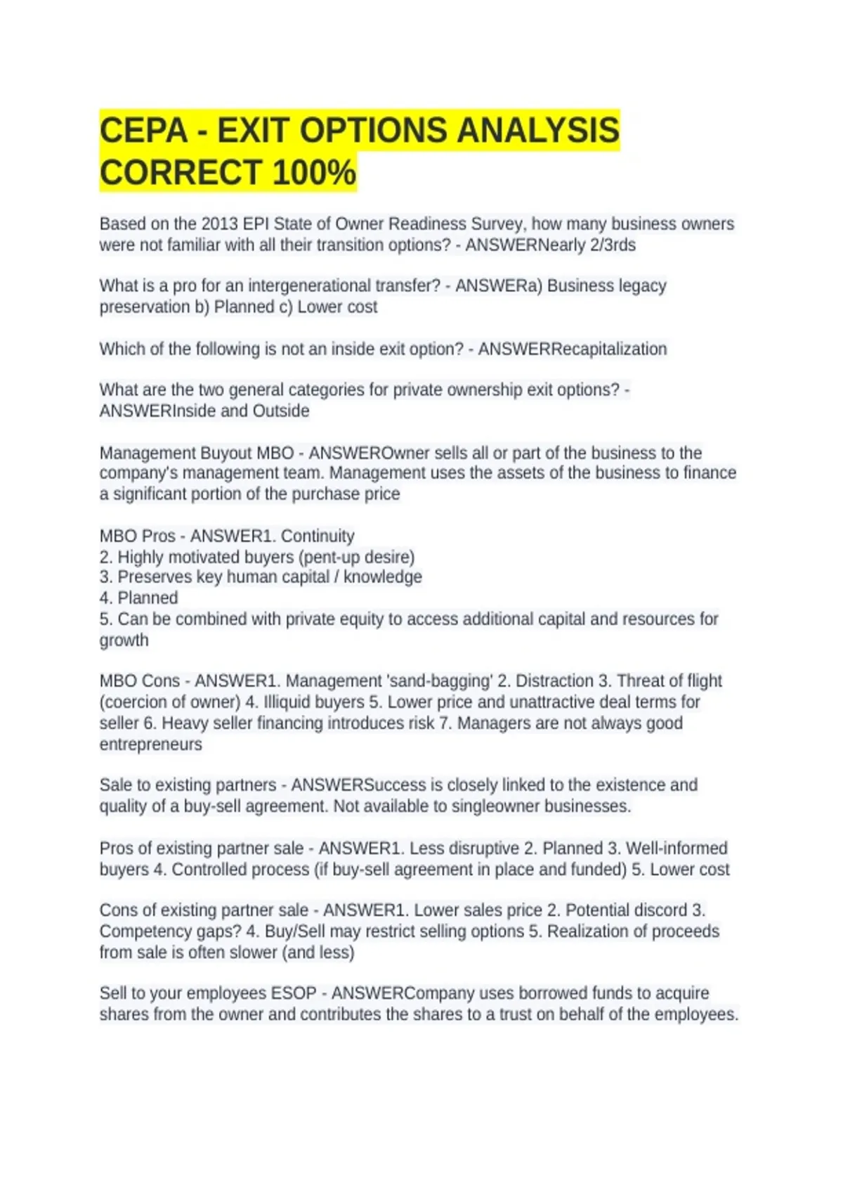 Management Buyout MBO - ANSWEROwner sells all or part of the business to the