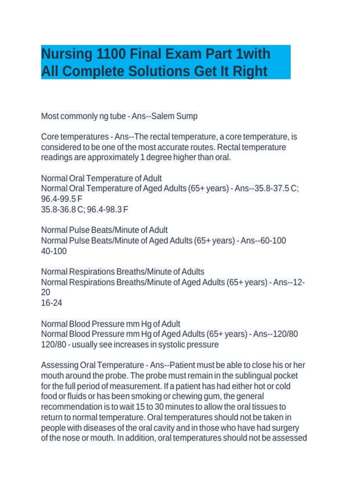 Nursing 1100 Final Exam Part 1with All Complete Solutions Get It Right