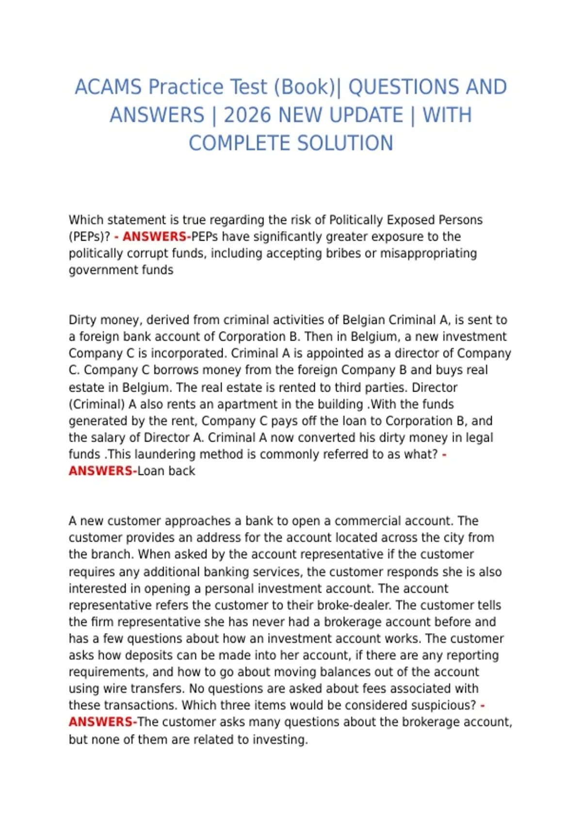 ACAMS Practice Test (Book)| QUESTIONS AND ANSWERS | 2026 NEW UPDATE | WITH COMPLETE SOLUTION