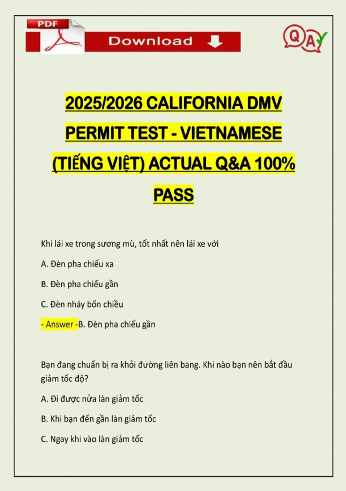 2025/2026 CALIFORNIA DMV PERMIT TEST - VIETNAMESE (TIẾNG VIỆT) ACTUAL Q&A 100% PASS Khi lái xe trong sương mù, tốt nhất nên lái xe với A. Đèn pha chiếu xa B. Đèn pha chiếu gần C. Đèn nháy bốn chiều - Answer -B. Đèn pha chiếu gần Bạn đang chuẩn bị ra khỏi đường liên bang. Khi nào bạn nên bắt đầu giảm tốc độ? A. Đi được nửa làn giảm tốc B. Khi bạn đến gần làn giảm tốc C. Ngay khi vào làn giảm tốc