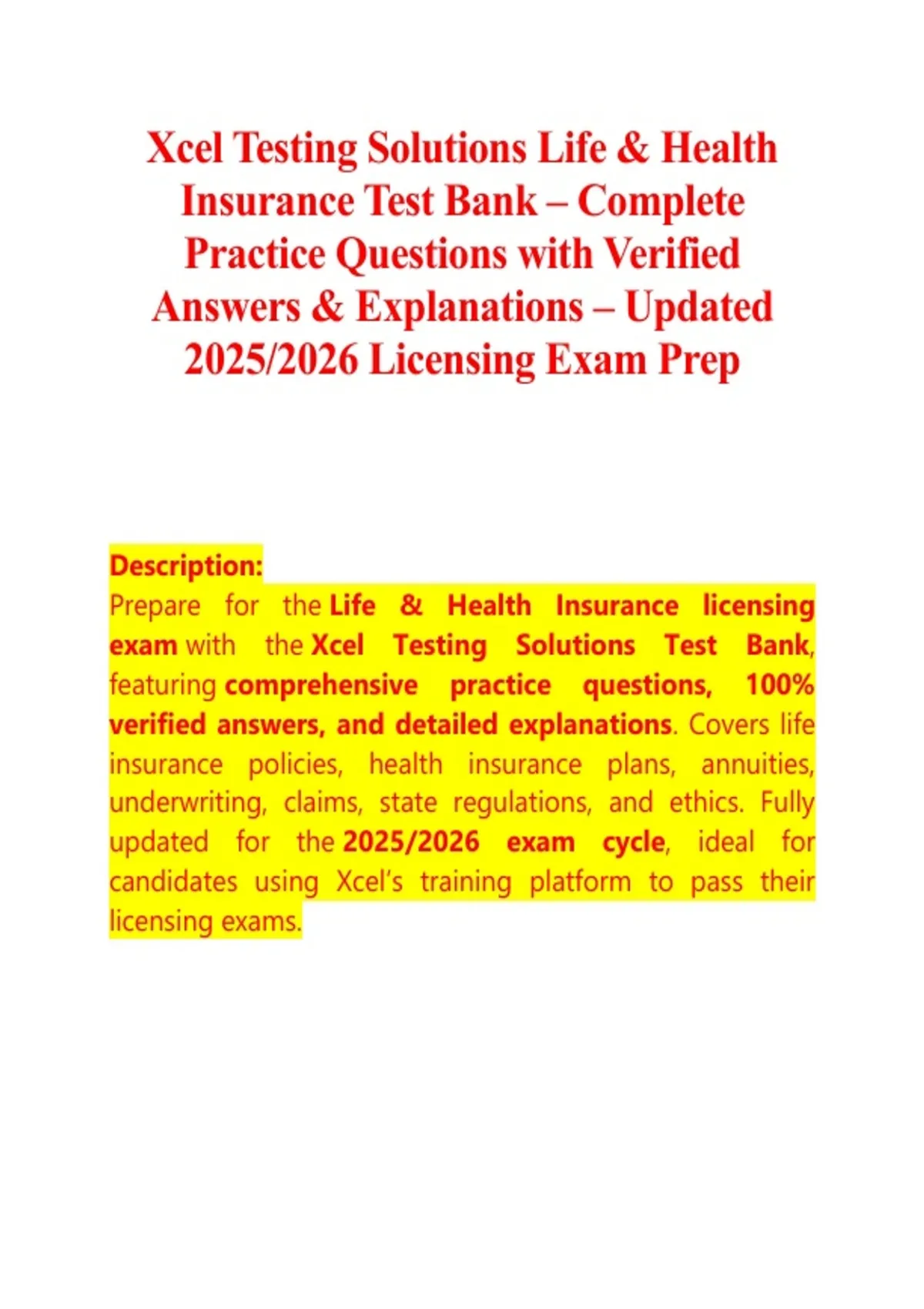 The Xcel Testing Solutions Life Test Bank provides a comprehensive collection of multiple-choice and scenario-based questions with verified answers for students and professionals preparing for life insurance licensing exams. Covers life insurance policies, annuities, underwriting, risk management, legal regulations, and industry practices. Designed for self-study, exam preparation, and classroom review. Fully updated for 2026/2027 to align with current life insurance education standards and licensing exam requirements.