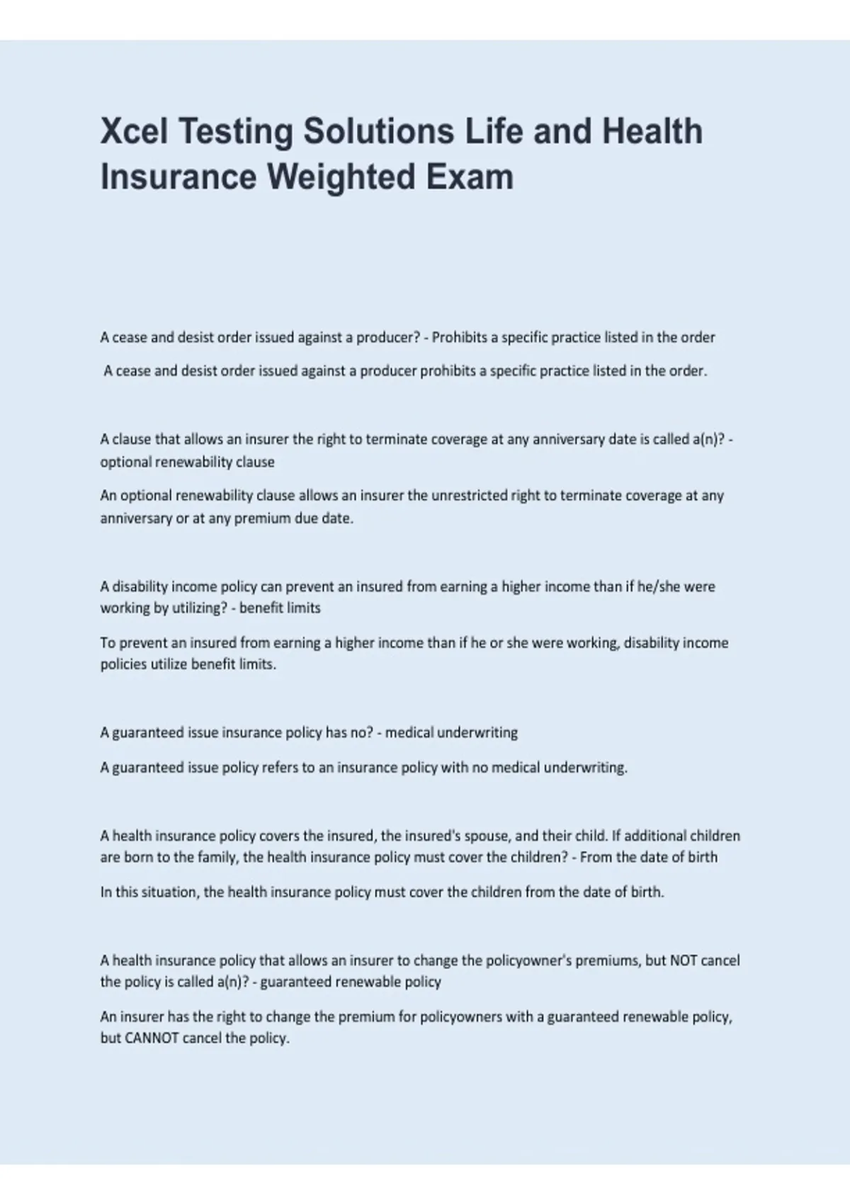 The XCEL Solutions Practice Exam Bank provides a comprehensive collection of multiple-choice and scenario-based questions with verified answers for students and professionals preparing for insurance licensing exams. Covers life insurance, health insurance, annuities, underwriting, risk management, and industry regulations. Designed for self-study, exam preparation, and classroom review. Fully updated for 2026/2027 to align with current insurance education standards and licensing requirements