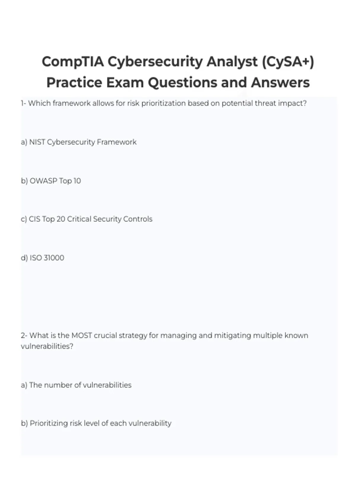 he CompTIA Cybersecurity Analyst (CySA+) Test Bank provides a comprehensive collection of multiple-choice, scenario-based, and performance-based questions with verified answers for IT professionals preparing for the CySA+ certification exam. Covers threat detection, vulnerability management, incident response, security monitoring, and cybersecurity best practices. Designed for self-study, exam preparation, and classroom review. Fully updated for 2026/2027 to align with current CompTIA CySA+ exam objectives and cybersecurity industry standards.