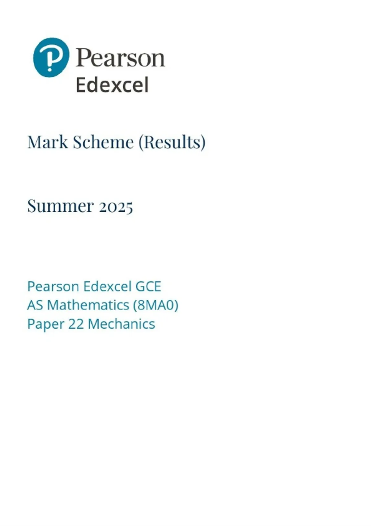 AS-LEVEL EDEXCEL 2025 MATHEMATICS MECHANICS PAPER 2 8MA0/22 MARK SCHEME