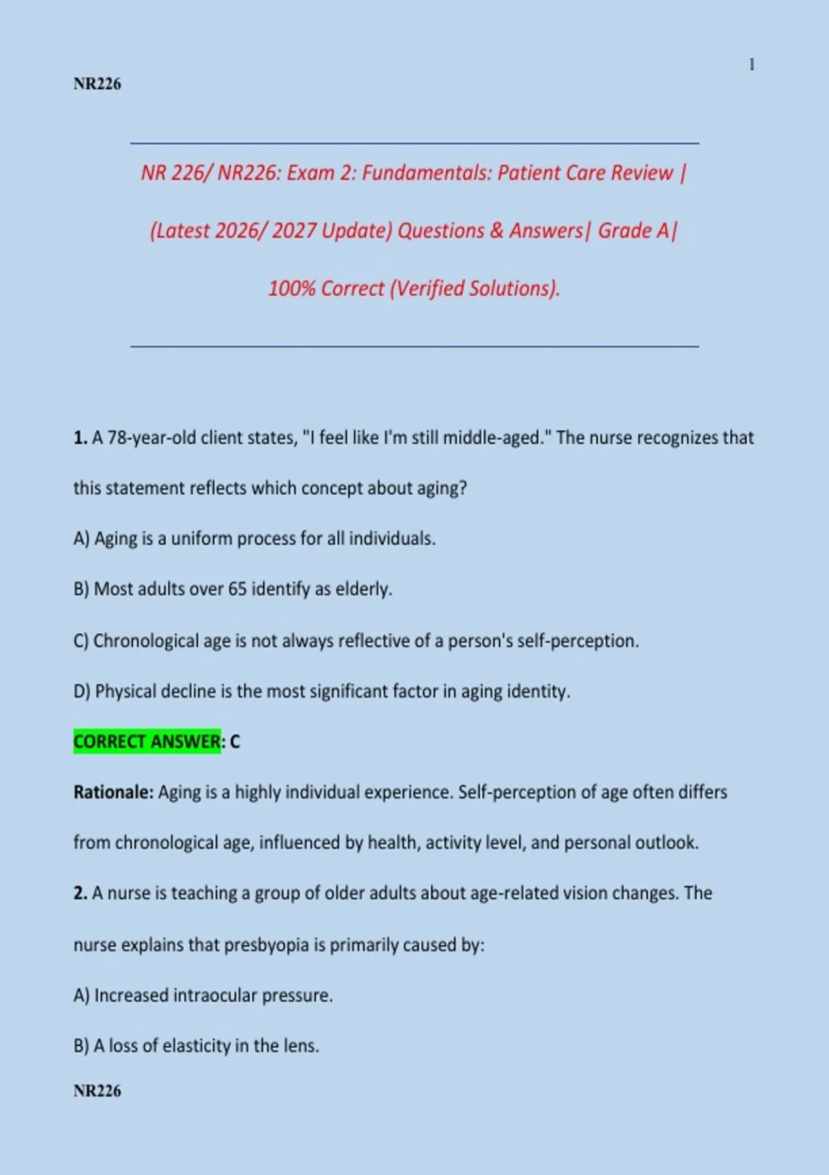 Exam 2: NR 226 / NR226 (Latest Update 2025 / 2026) Fundamentals: Patient Care | Test practice Questions & Answers | 100% Correct | Grade A - Chamberlain