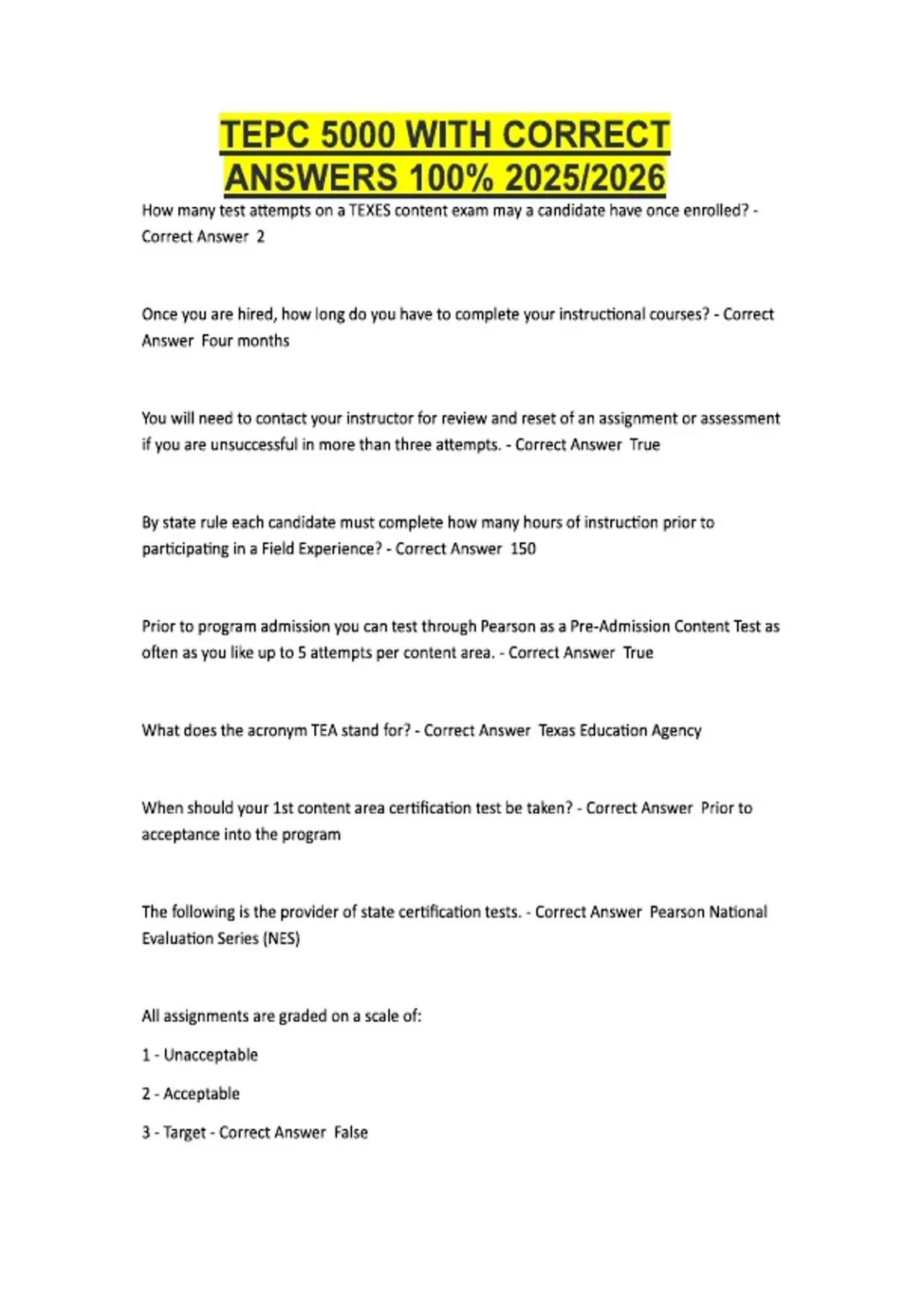 TEPC 5000 WITH CORRECT ANSWERS 100% 2025/2026 How many test attempts on a TEXES content exam may a candidate have once enrolled? - Correct Answer 2 Once you are hired, how long do you have to complete your instructional courses? - Correct Answer Four months You will need to contact your instructor for review and reset of an assignment or assessment if you are unsuccessful in more than three attempts. - Correct Answer True By state rule each candidate must complete how many hours of instruction prior to participating in a Field Experience? - Correct Answer 150 Prior to program admission you can test through Pearson as a Pre-Admission Content Test as often as you like up to 5 attempts per content area. - Correct Answer True What does the acronym TEA stand for? - Correct Answer Texas Education Agency When should your 1st content area certification test be taken? - Correct Answer Prior to acceptance into the program The following is the provider of state certification tests. - Correct Answer Pearson National Evaluation Series (NES) All assignments are graded on a scale of: 1 - Unacceptable 2 - Acceptable 3 - Target - Correct Answer False You must make corrections and resubmit an assignment when your assignment is graded as a - Correct Answer 1 Content Area means - Correct Answer The subject matter in which you will be teaching Except for this assessment, you will have to RETAKE an assessment if you have a grade less than - Correct Answer 80 If you must retake an assessment, whe