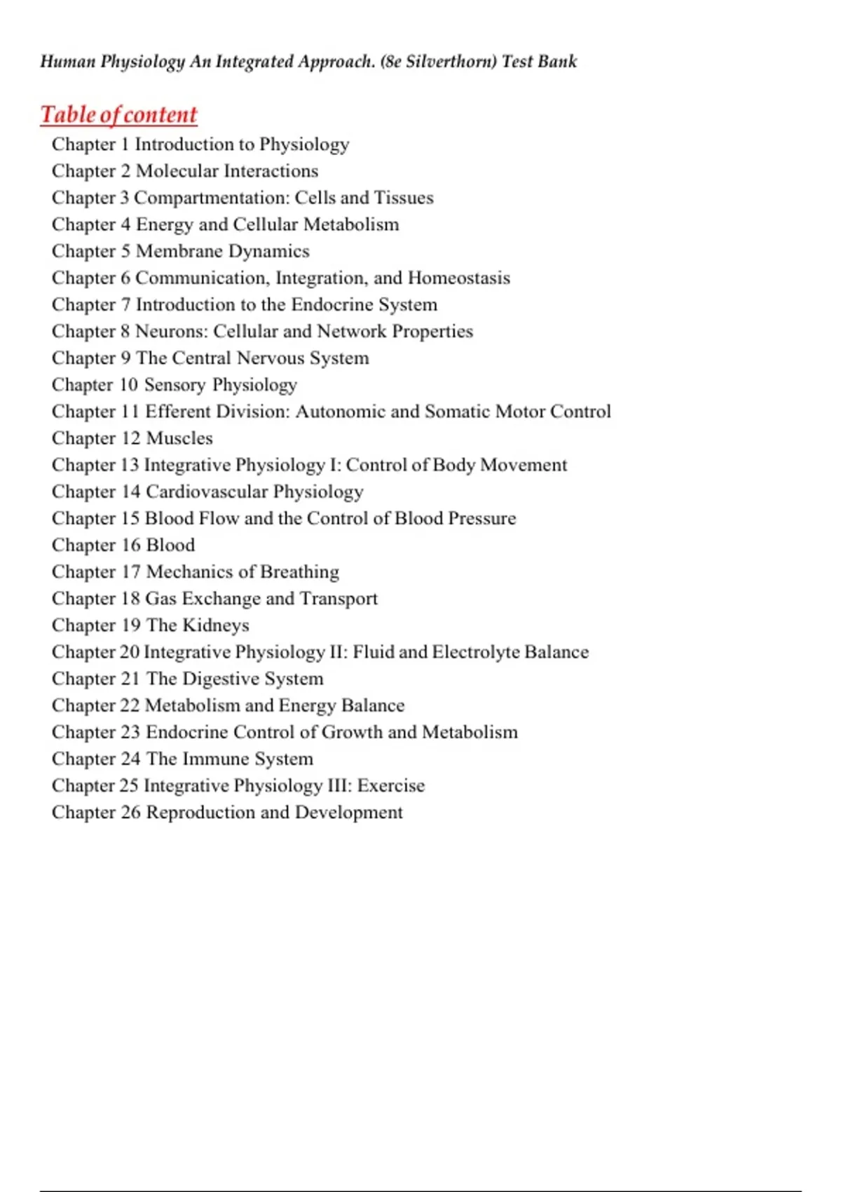 The Human Physiology: An Integrated Approach, 8th Edition Test Bank by Silverthorn provides a comprehensive collection of multiple-choice, true/false, and application-based questions with verified answers for students in health sciences, pre-med, and nursing programs. Covers cellular physiology, organ systems, homeostasis, neurophysiology, cardiovascular, respiratory, endocrine, and renal systems with clinical applications. Designed for self-study, exam preparation, and classroom review. Fully updated for 2026/2027 to align with current human physiology education standards and practical healthcare competenci
