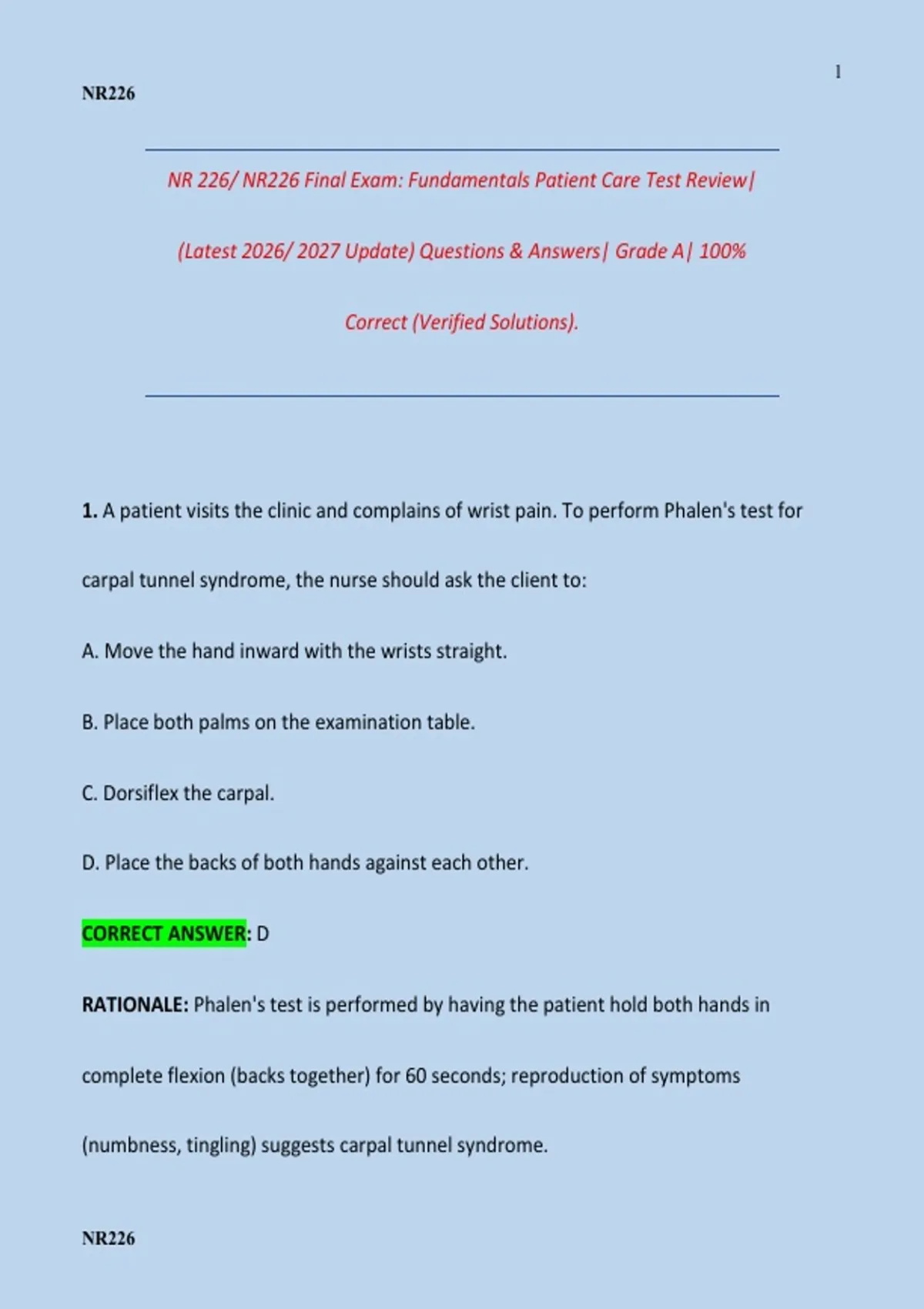 1. A patient visits the clinic and complains of wrist pain. To perform Phalen's test for