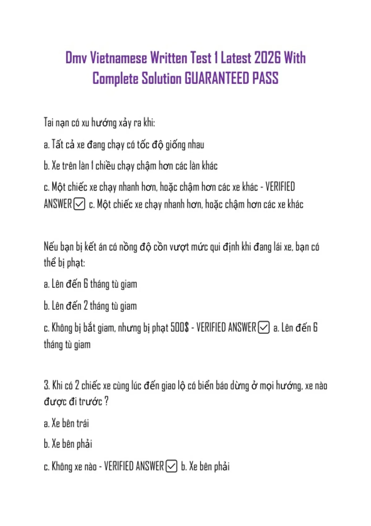 The DMV Vietnamese Written Test 1 – Latest 2026 Edition is a fully updated study and practice resource designed specifically for Vietnamese-speaking learners preparing for the U.S. DMV written knowledge test. This exam set includes real exam-style DMV questions with complete, accurate answers provided entirely in Vietnamese, making it easier to understand traffic laws, road signs, safe driving rules, right-of-way regulations, speed limits, alcohol and drug laws, parking rules, and defensive driving concepts. Updated for 2026, this practice test reflects the most current DMV handbook standards used across U.S. states. The questions are structured to match the actual DMV written exam format, helping test-takers build confidence, improve comprehension, and pass on the first attempt. Ideal for first-time drivers, permit applicants, license renewals, and ESL learners, this resource provides a clear, easy-to-follow solution guide that supports rapid learning and exam success. Perfect for self-study, classroom use, or final review, this GUARANTEED PASS DMV Vietnamese test is a trusted preparation tool.