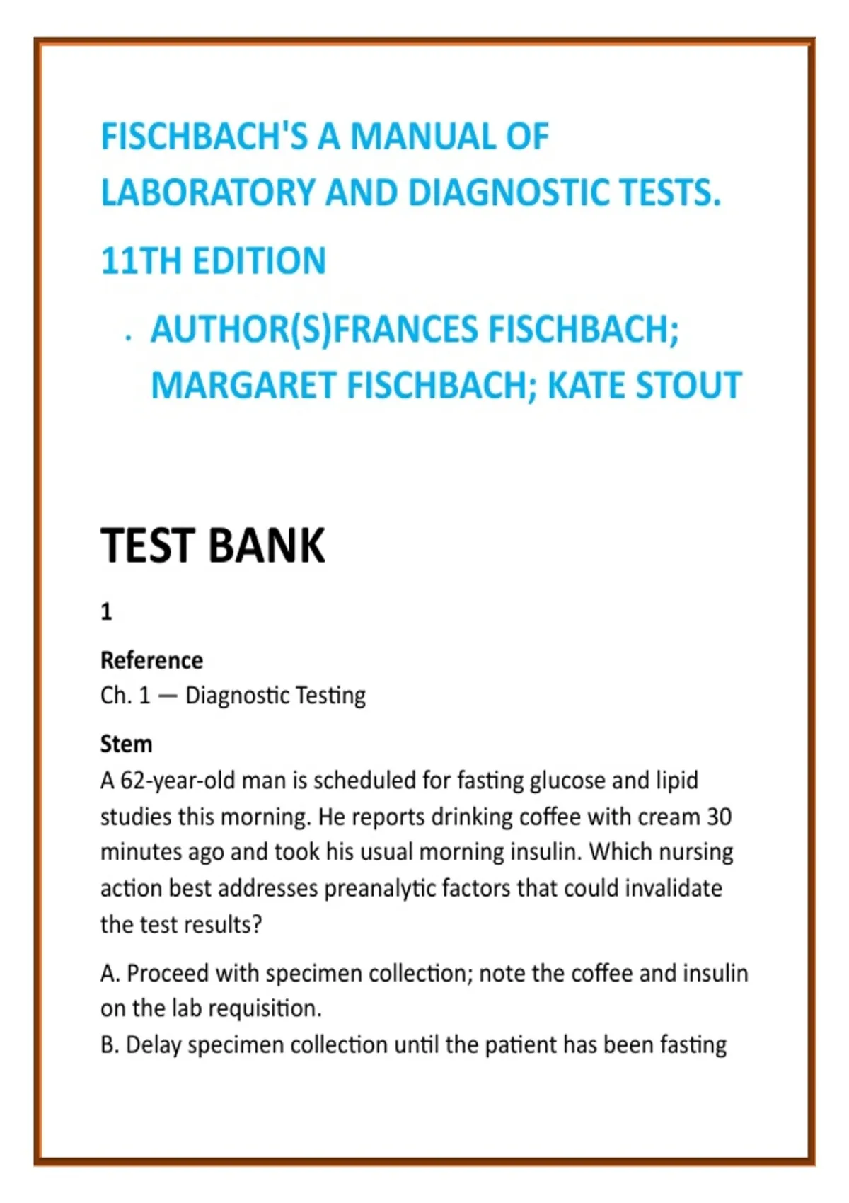 Fischbach Laboratory Test Bank | Nursing Test Bank 2026 | Diagnostic Test Interpretation MCQs & Lab Values Review 2) SEO Product Description (200–300 words) Master laboratory and diagnostic test interpretation with this comprehensive Nursing Test Bank built directly from Fischbach’s A Manual of Laboratory and Diagnostic Tests, 11th Edition—the gold-standard reference for nursing and allied health diagnostics education. This digital product delivers FULL textbook coverage across all units and chapters, with 20 clinically focused multiple-choice questions (MCQs) per chapter. Each question is designed to strengthen real-world diagnostic reasoning, not rote memorization. Every item includes clear correct answers and concise, evidence-based rationales aligned with Fischbach’s terminology, reference ranges, and clinical interpretations. The test bank emphasizes clinical decision-making, abnormal and critical findings, patient preparation, specimen collection, diagnostic procedures, and post-test nursing responsibilities—helping learners reduce clinical errors and build confidence for exams and practice. Ideal for students enrolled in: Laboratory & Diagnostic Tests in Nursing Health Assessment & Diagnostics Clinical Nursing Practice Medical-Surgical Nursing (diagnostic components) Practical Nursing (PN/LPN) programs Associate Degree Nursing (ADN) programs BSN clinical courses emphasizing diagnostics and patient monitoring Key Features Full-chapter coverage of Fischbach’s Manual (11th Edition) 20 high-quality diagnostic MCQs per chapter NCLEX-style clinical interpretation scenarios Accurate lab values, diagnostic procedures, and safety considerations Focus on abnormal results, trends, and provider notification criteria Time-efficient study tool for exams and clinical preparation Whether you are preparing for nursing exams or strengthening bedside diagnostic judgment, this Fischbach laboratory test bank provides a structured, reliable, and clinically relevant study solution trusted across nursing education. 3) 8 High-Value SEO Keywords Fischbach laboratory test bank nursing diagnostic tests MCQs laboratory and diagnostic tests nursing MCQs Fischbach lab values review diagnostic test interpretation study guide nursing lab interpretation test bank laboratory values nursing study guide clinical diagnostics nursing exam prep 4) 10 Hashtags #NursingTestBank #LaboratoryDiagnostics #FischbachTestBank #NursingLabValues #DiagnosticTestsNursing #ClinicalInterpretation #NursingExamPrep #MedicalSurgicalNursing #ADNBSN #NCLEXPreparation