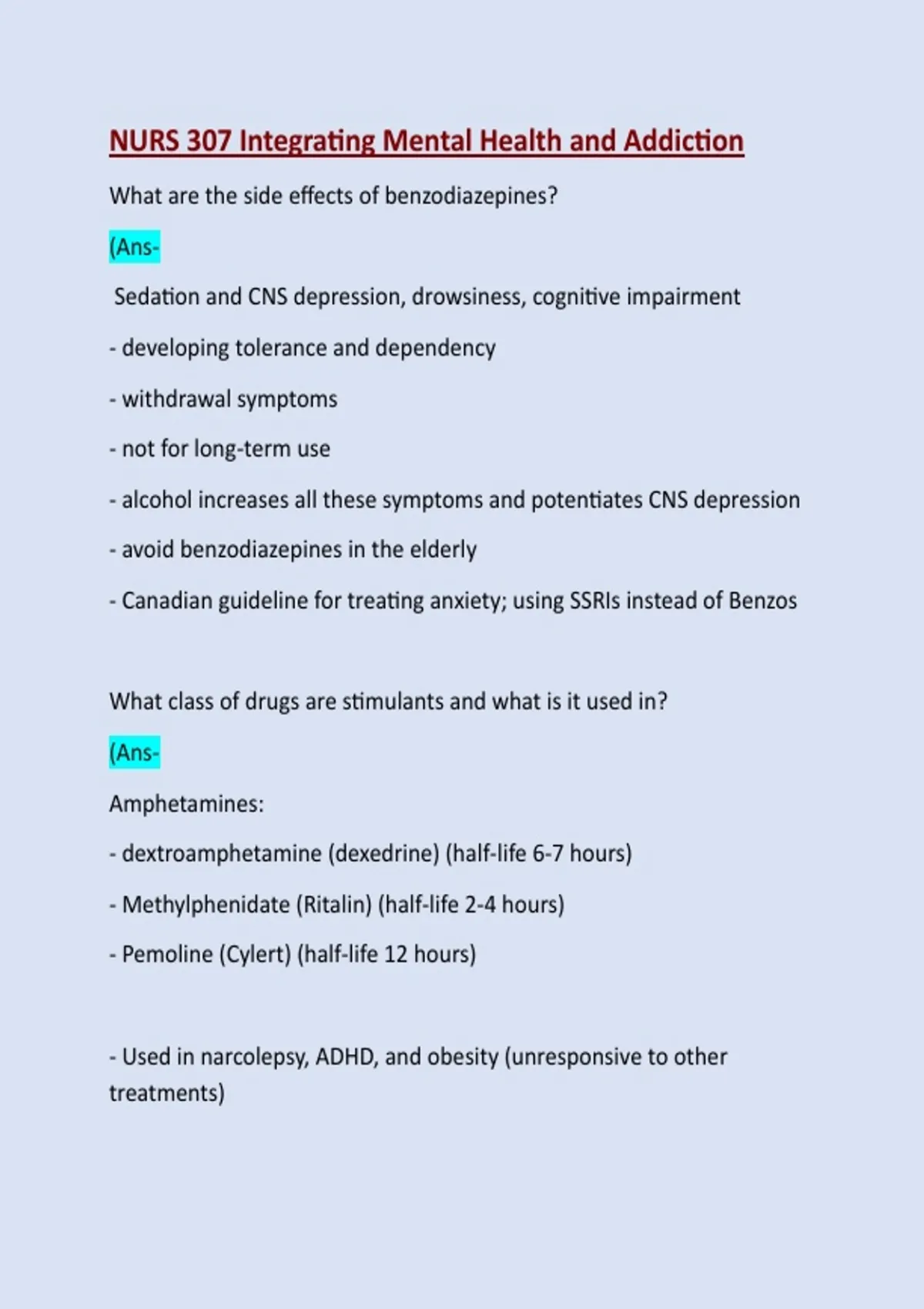 What are the side effects of benzodiazepines? (AnsSedation and CNS depression, drowsiness, cognitive impairment - developing tolerance and dependency - withdrawal symptoms - not for long-term use - alcohol increases all these symptoms and potentiates CNS depression - avoid benzodiazepines in the elderly - Canadian guideline for treating anxiety; using SSRIs instead of Benzos What class of drugs are stimulants and what is it used in? (AnsAmphetamines: - dextroamphetamine (dexedrine) (half-life 6-7 hours) - Methylphenidate (Ritalin) (half-life 2-4 hours) - Pemoline (Cylert) (half-life 12 hours) - Used in narcolepsy, ADHD, and obesity (unresponsive to other treatments)- Exact mechanism is unknown, but the medications target neurotransmitters such as dopamine, NE, serotonin, and catecholamine. What is the etiology and neurobiology of ADHD remain unclear. What is the off-label use of stimulants and side effects? (Ans- - adjunction with other antidepressants to treat depression, relieve lethargy, and reduced cognitive deficits - insomnia, nervousness, restlessness, tachycardia, heart problems, and risk for growth suppression What is some patient education when non-adherence to medication occurs? (AnsImportance of medication adherence: relapse - attitude toward medication - insight - side effects (SE) Patient teaching; -identify the reasons, - importance of medication regimen - if due to SE:review dose or change medication class, drug interaction, loss weight strategies