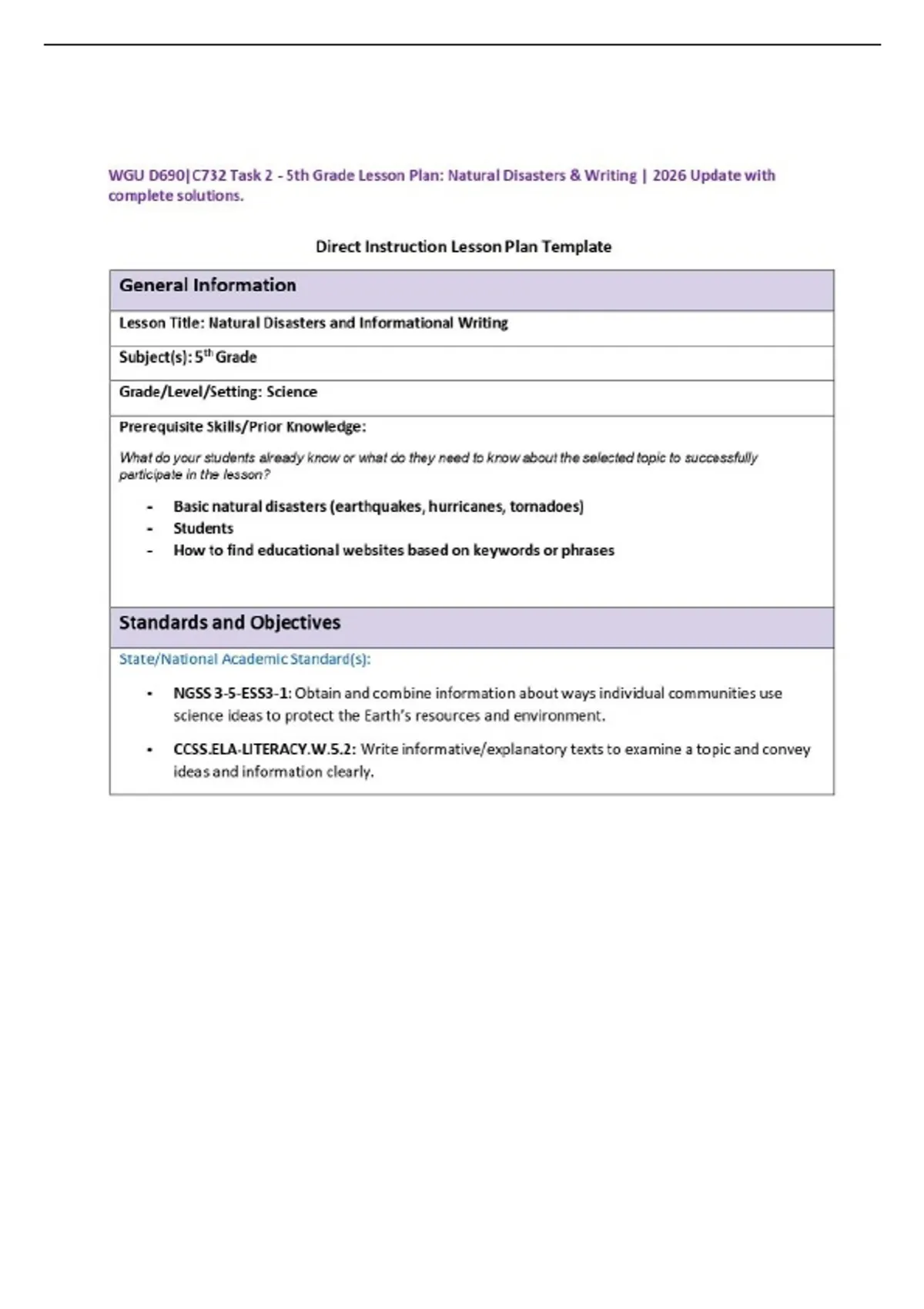 WGU D690|C732 Task 2 - 5th Grade Lesson Plan: Natural Disasters & Writing | 2026 Update with complete solutions.