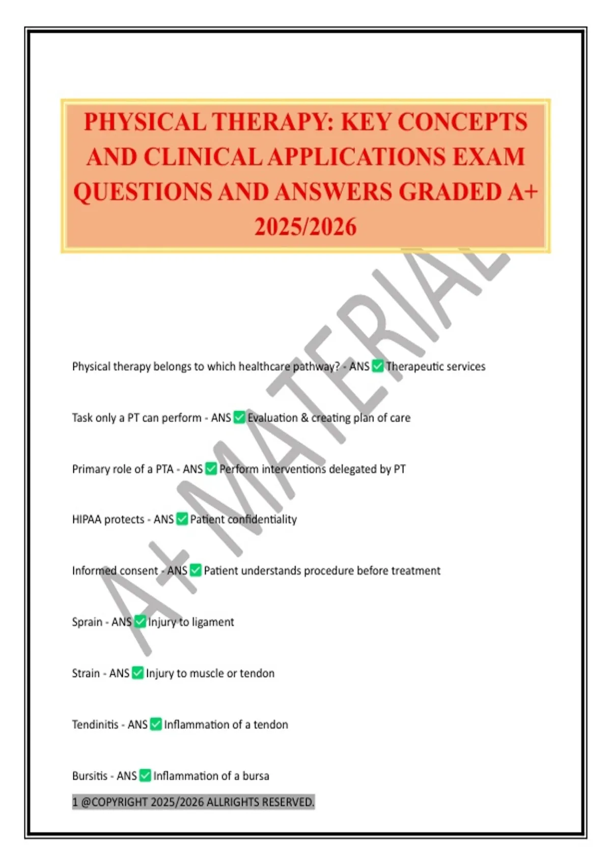 PHYSICAL THERAPY: KEY CONCEPTS AND CLINICAL APPLICATIONS EXAM QUESTIONS AND ANSWERS GRADED A+ 2025/2026