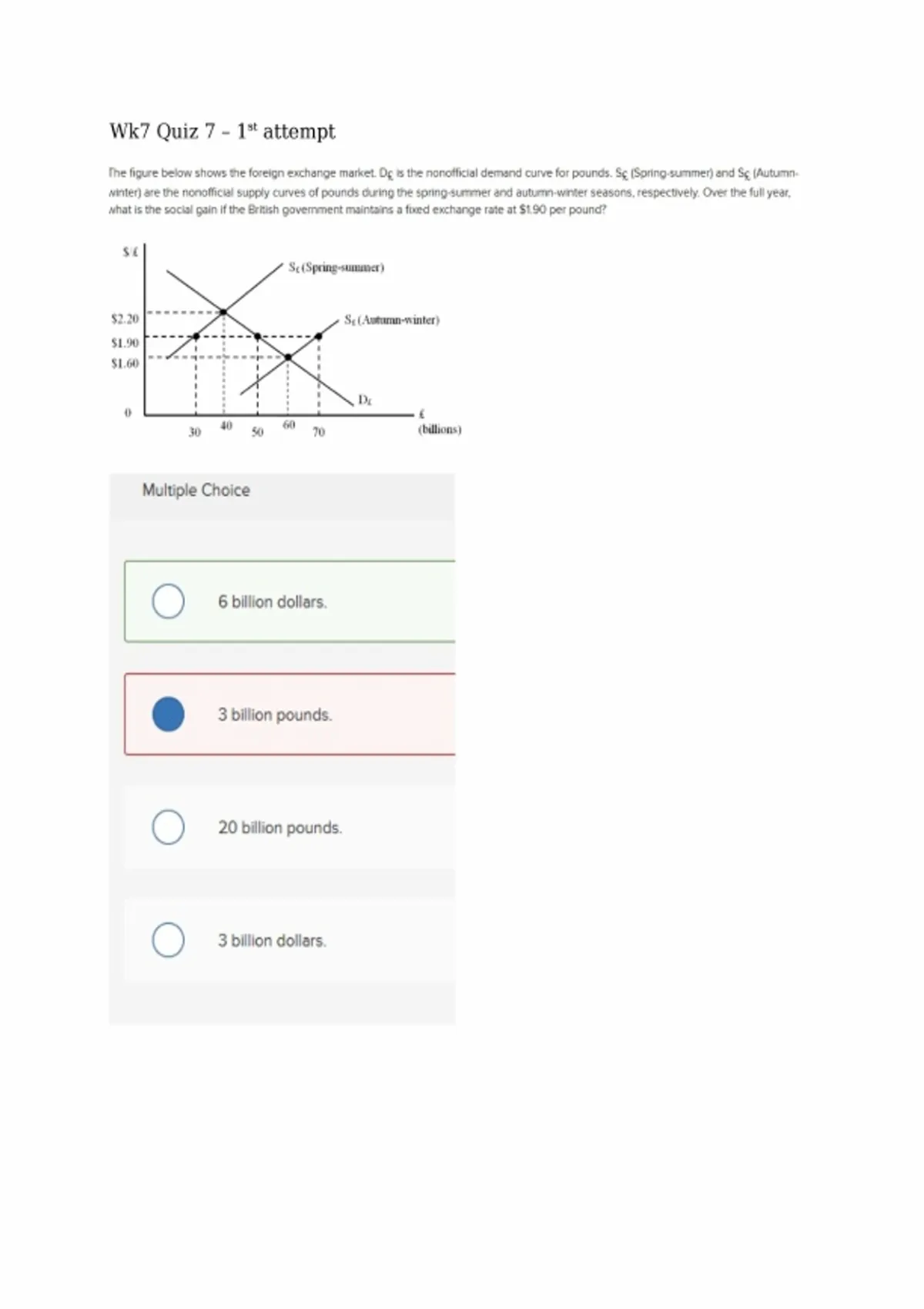 The figure below shows the foreign exchange market. Dg is the nonofficial demand curve for pounds. Sg (Spring-summer) and Sg (Autumn-