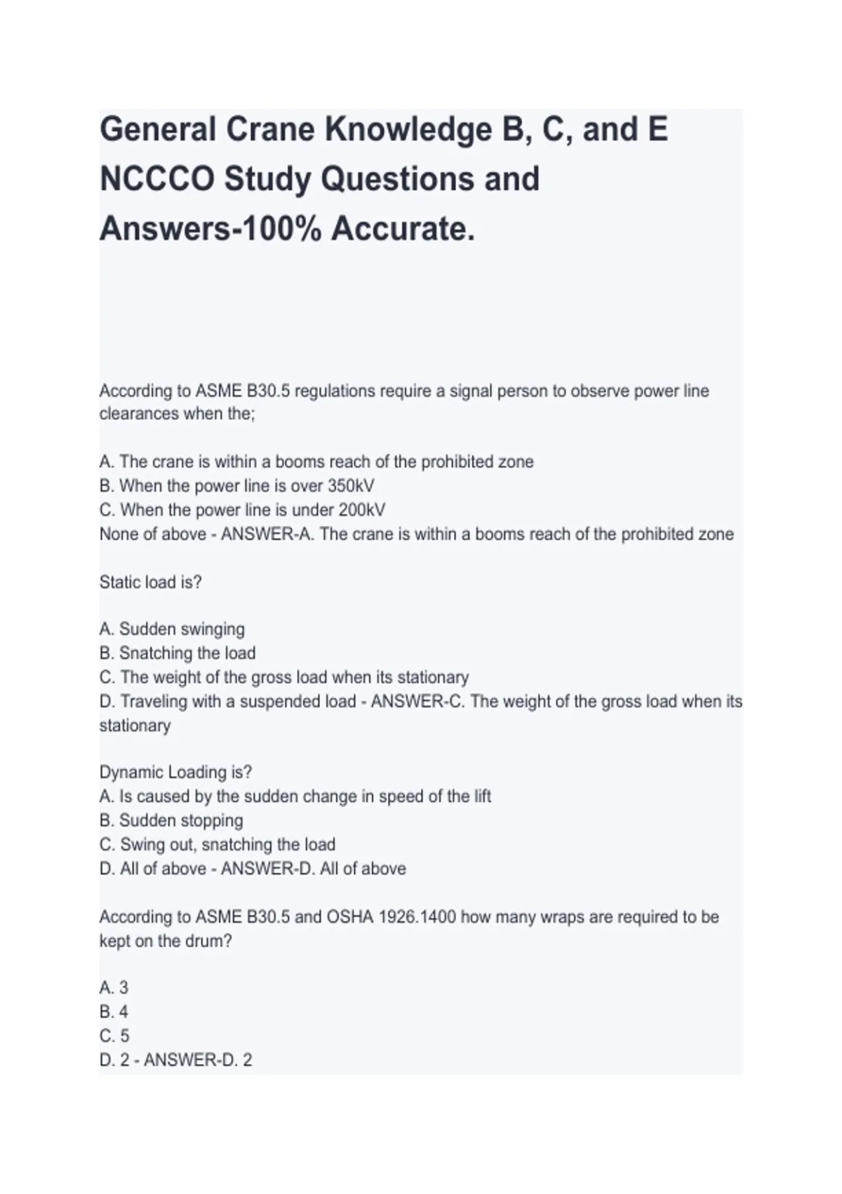 Crane Course Test Bank is a comprehensive resource for professionals preparing for crane operator certification and construction equipment safety exams. Includes verified multiple-choice, true/false, and scenario-based questions covering crane operation, load management, safety protocols, inspection procedures, and regulatory compliance. Designed for self-study, classroom review, and exam readiness, this resource enhances practical knowledge, safety awareness, and certification success. Updated for to reflect current OSHA standards and industry best practices.