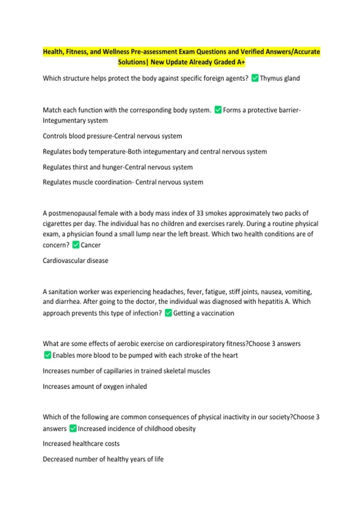 Health, Fitness, and Wellness Pre-assessment Exam Questions and Verified Answers/Accurate