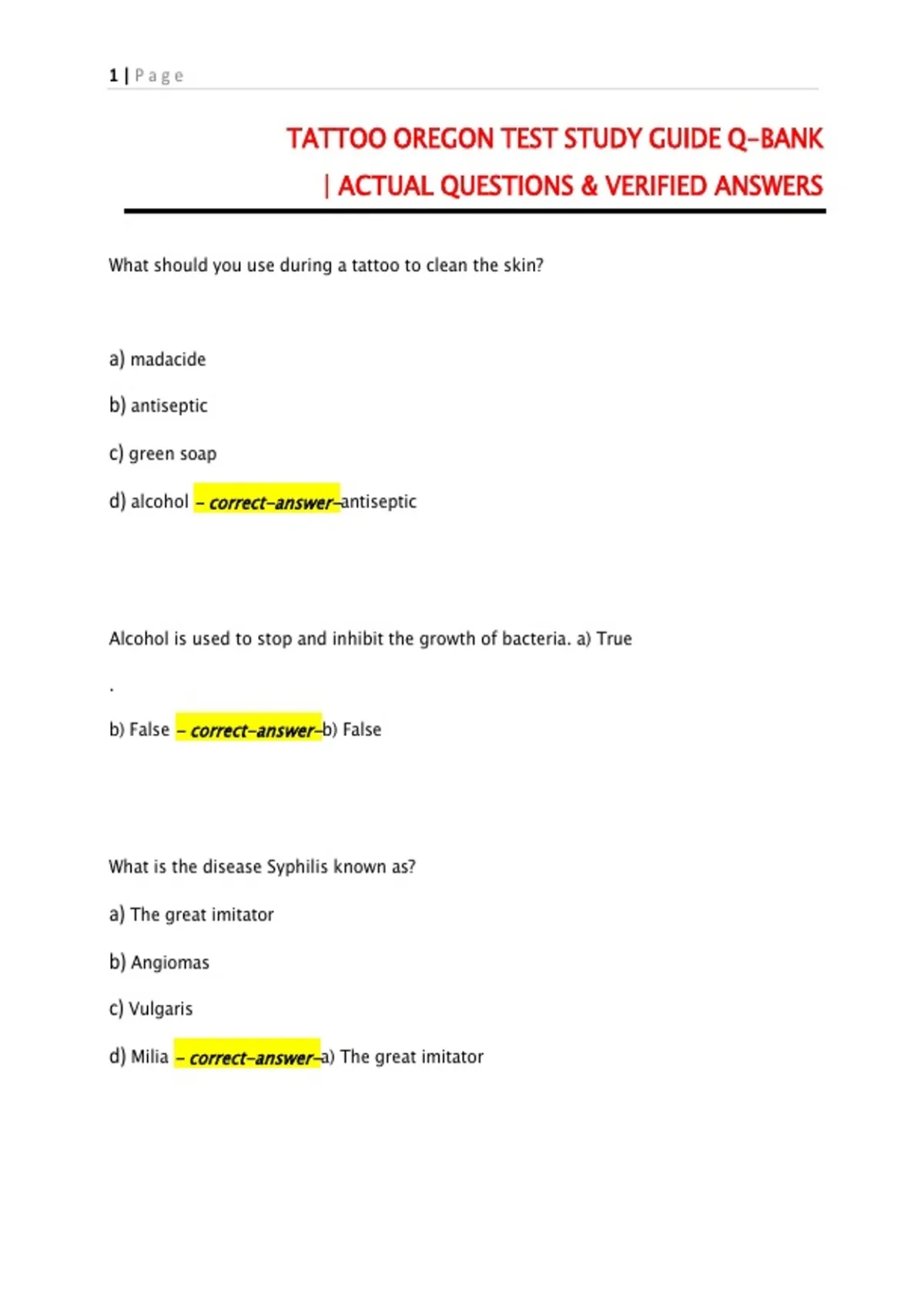Oregon Tattoo Test Study Guide Q-Bank | Actual Questions & Verified Answers