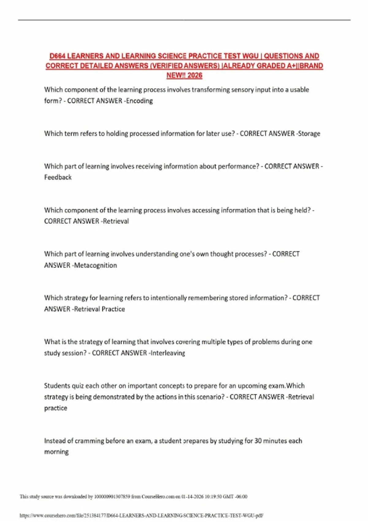 Pass your WGU D664 Learners and Learning Science Objective Assessment on the first attempt with this comprehensive practice test, fully updated for 2026. This document features a robust collection of exam-style questions and verified correct answers, specifically designed to align with the Western Governors University curriculum. Detailed coverage includes critical learning process components such as encoding, storage, and metacognition, alongside advanced study strategies like interleaving and retrieval practice. Deep dive into the developmental theories of Piaget (Preoperational and Formal Operational stages) and Erikson (Identity vs. Role Confusion) to ensure you are prepared for the scenario-based questions common in the OA. Whether you are studying cognitive development or instructional teaching strategies, these materials provide the exact insights and clarity needed to secure an Exemplary (A+) grade. Stop the guesswork and utilize a resource that mirrors the rigor of the actual 2026 assessment to accelerate your degree progress.
